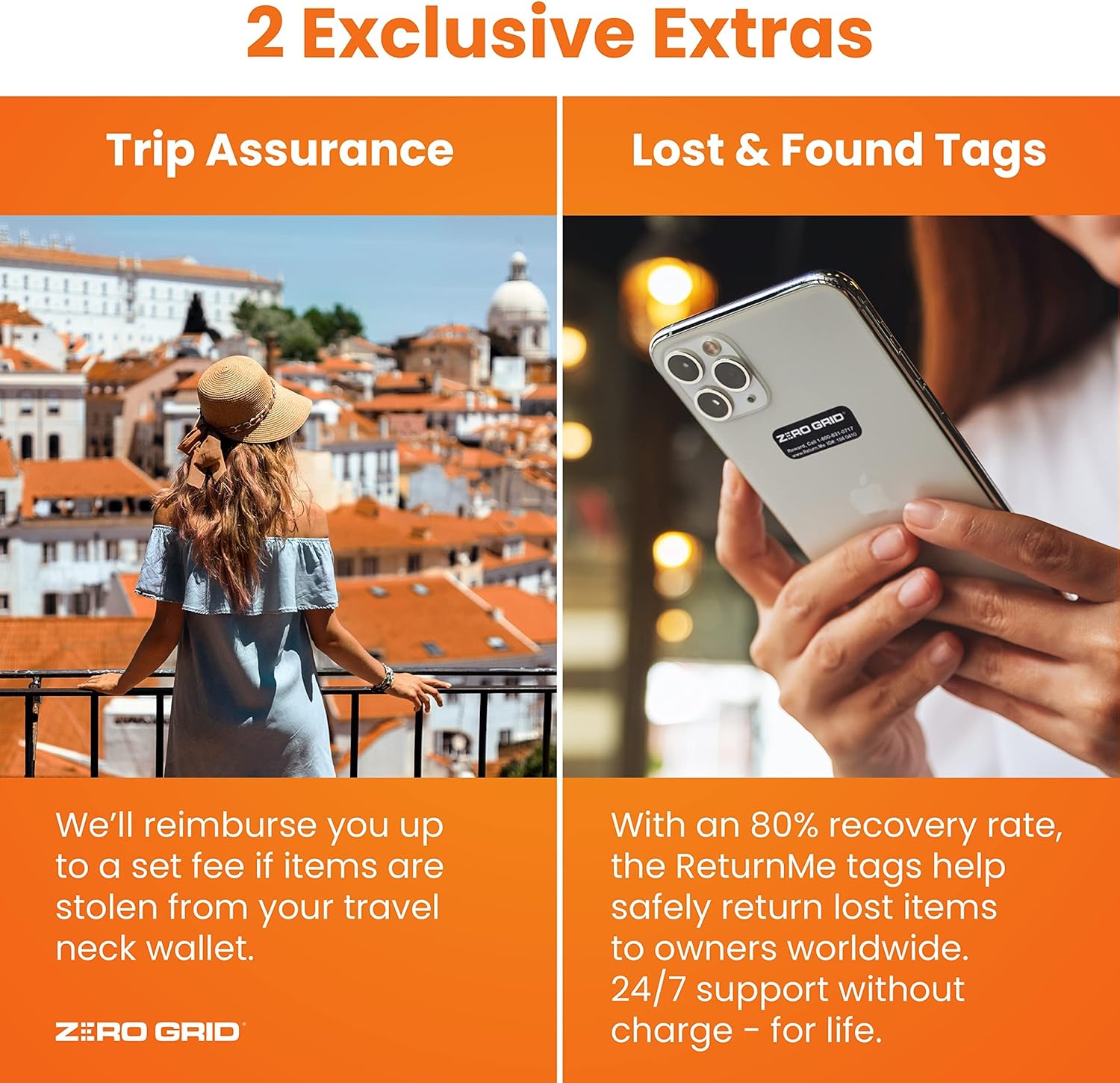 - UNRIVALED VALUE INCLUDED **BONUS #1** - EXCLUSIVE $300 TRIP ASSURANCE: In the event items are stolen from this passport holder, we will reimburse you up to $300. Complete Peace of Mind for your upcoming Trip! **BONUS #2 ** GLOBAL LOST & FOUND TAGS - Each Zero Grid Travel Wallet includes 2 Recovery Tags from ReturnMe, the world’s largest lost & found company. By purchasing this pickpocket proof wallet from Zero Grid, this service is FREE for life.