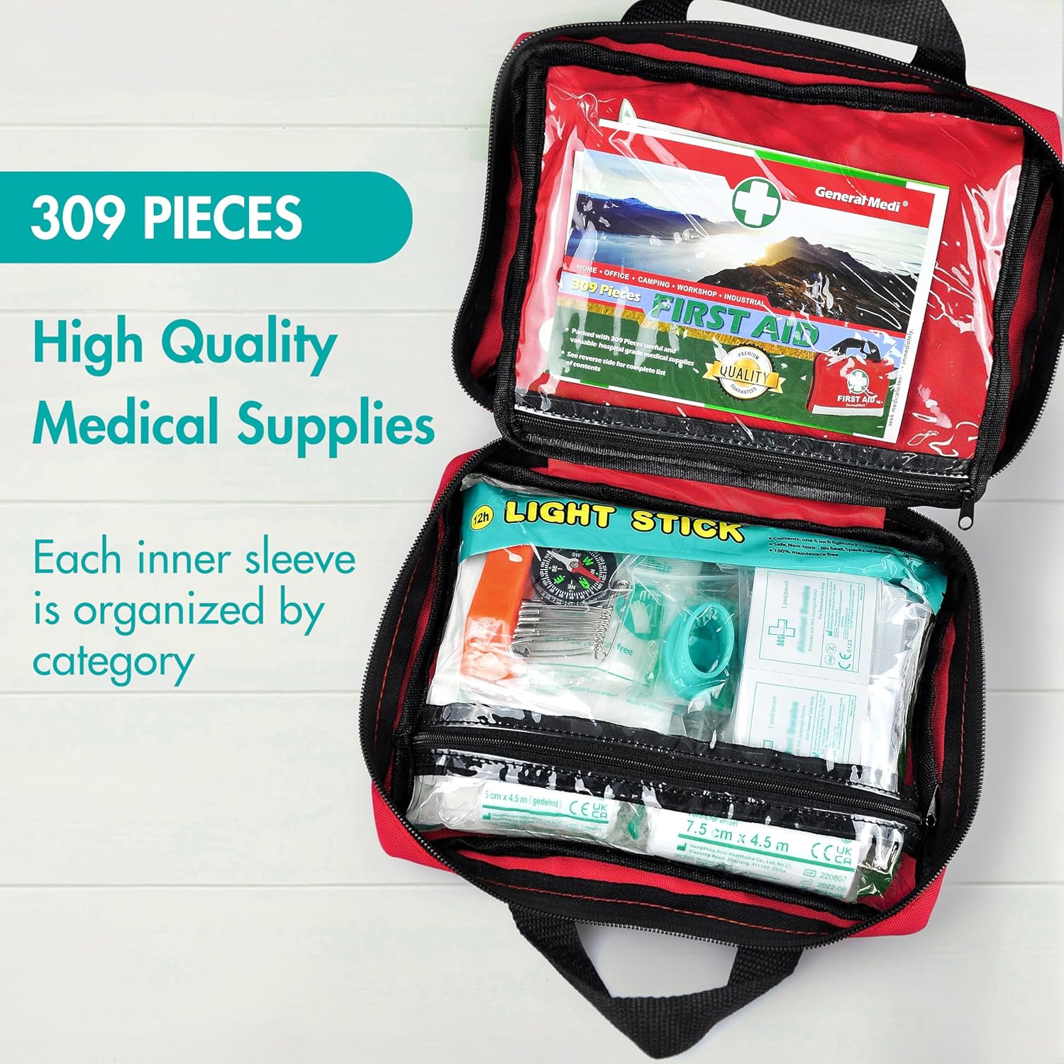 General Medi First Aid Kit -309 Pieces- Reflective Bag Design - Including Bandages, Moleskin Pad and Emergency Blanket for Travel, Home, Office, Car, Camping, Workplace