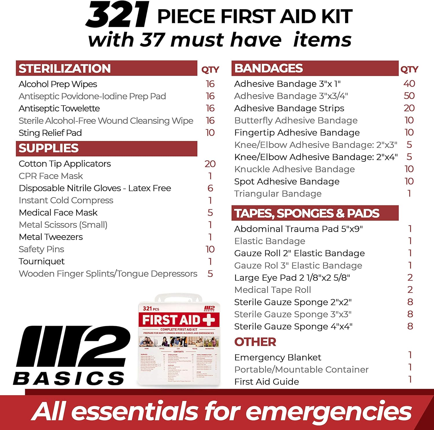M2 BASICS Premium 321 Piece First Aid Kit - First Aid Kit for Home, Car, Business, Office, School, Travel, Camping, Outdoors - Emergency Medical Supplies, Durable Portable Hard Case