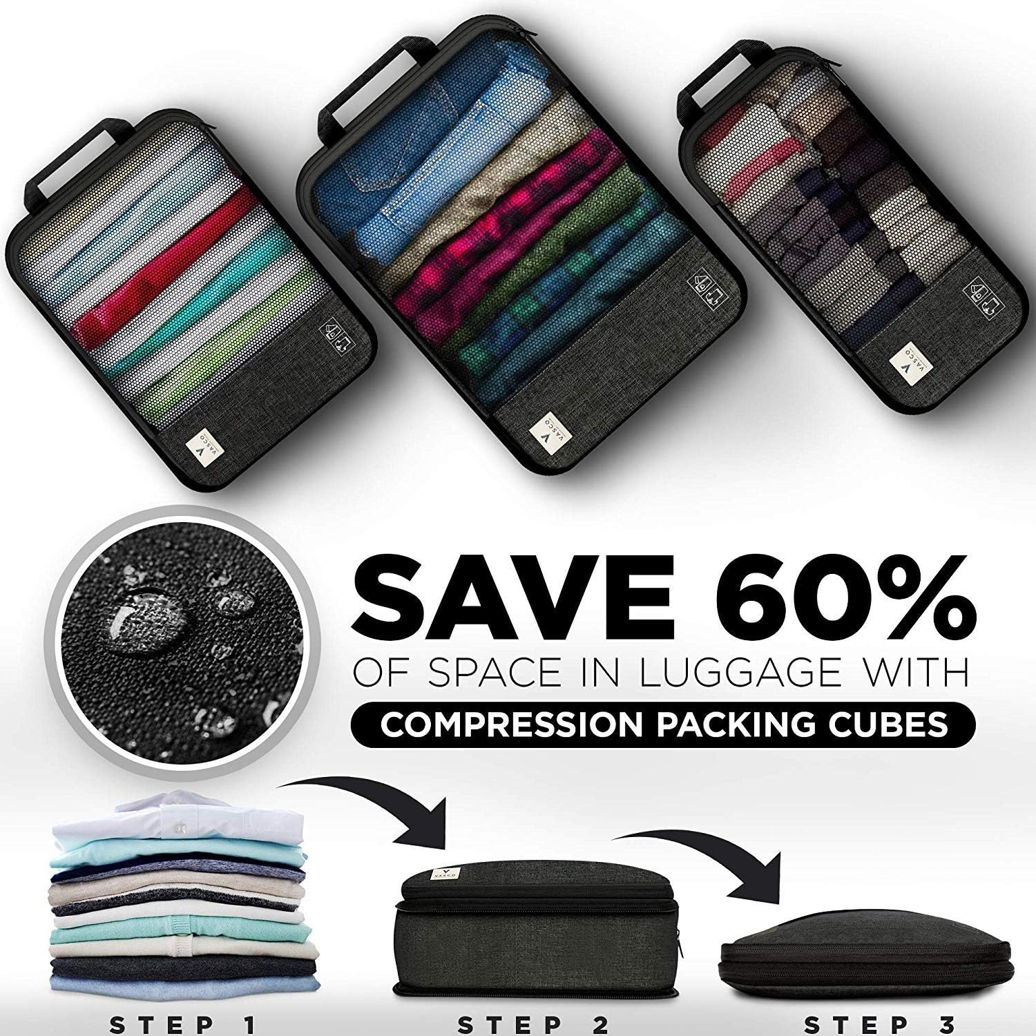 • EASY TO USE DESIGN – Our luggage organizer set comprises of slim pack cubes with integrated handles that make it easy to handle & move around each cube individually, see-through mesh to easily Identify the contents of each cube, and opaque areas that help have privacy for your intimates. Moreover, our packing cubes (compression) prove easy to clean and remain new like even after several washes.
