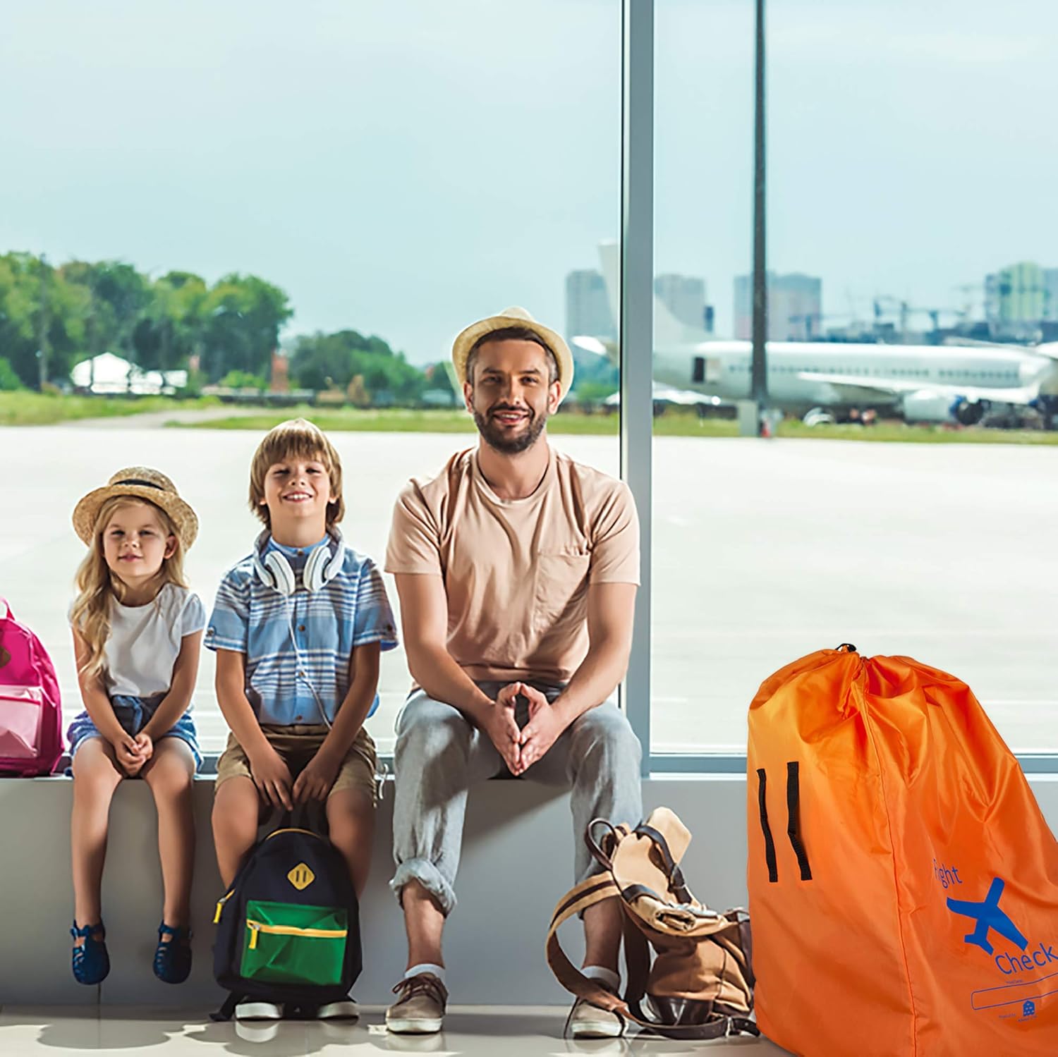 - BRIGHT ORANGE AND EASY TO SPOT - this car seat gate check bag universally fits most size car seats. This bag measures are 36" long X 18" high X 18" deep. It helps to protect contents from dirt and damage. It is essential for travel. . Folds up into a handy travel pouch. Easy to slip into you handbag or hand baggage when not in use. Experience will tell you weight is everything when traveling - Avoid bulky or padded wheelie car seat travel bags