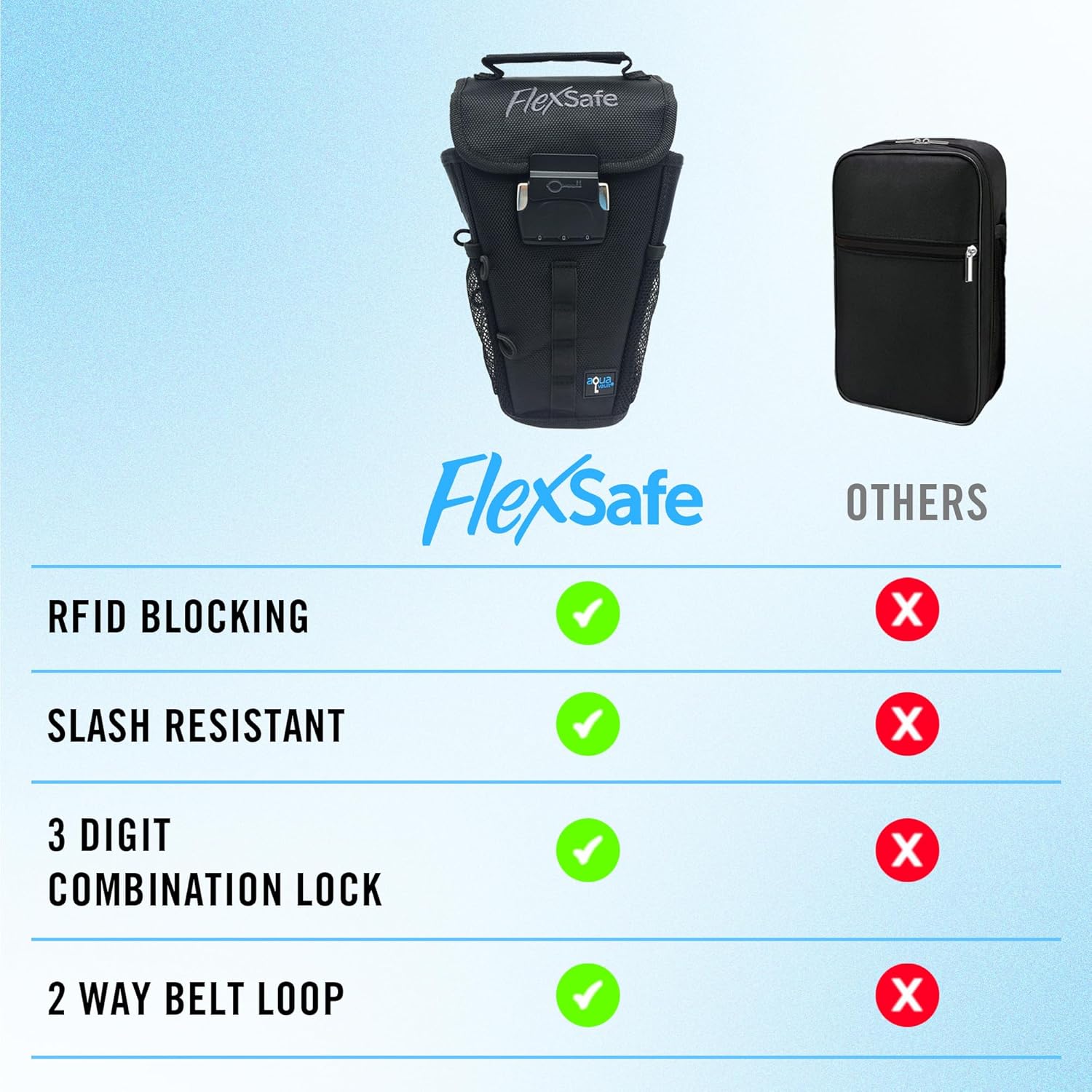 - PORTABLE & SECURE. The FlexSafe is a lightweight, flexible, and portable travel safe. Its compact design makes it easy to travel with and the patented locking design keeps your valuables secure. Dimensions 10" x 6" x 3" (9 oz).