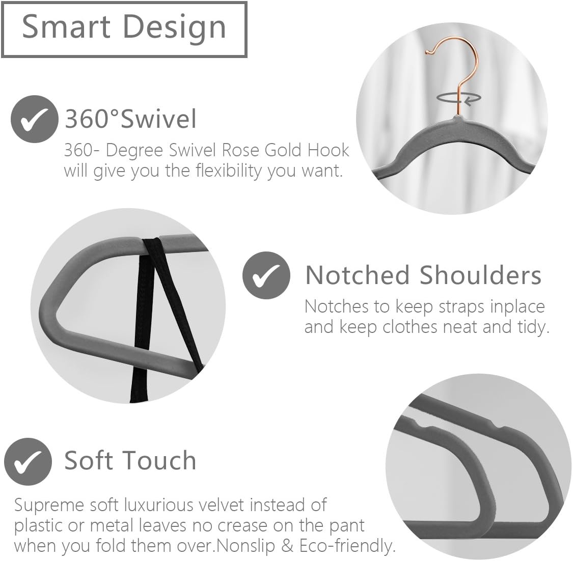 - SWIVEL ROSEGOLD HOOKS - can be 360 degree rotated, which easy sorting of clothes no matter which direction you hang your clothes, strongly attached to our durable hanger so the hook doesn't detach or snap easily