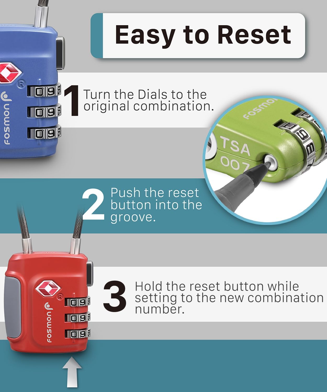 - [EASY TO READ AND SET DIALS] The numbers on the dials are easy to read without reading glasses, and you never need to worry about losing the key to your lock. You can easily reset the combination with a pen or other tool, with no worries about resetting it accidentally.