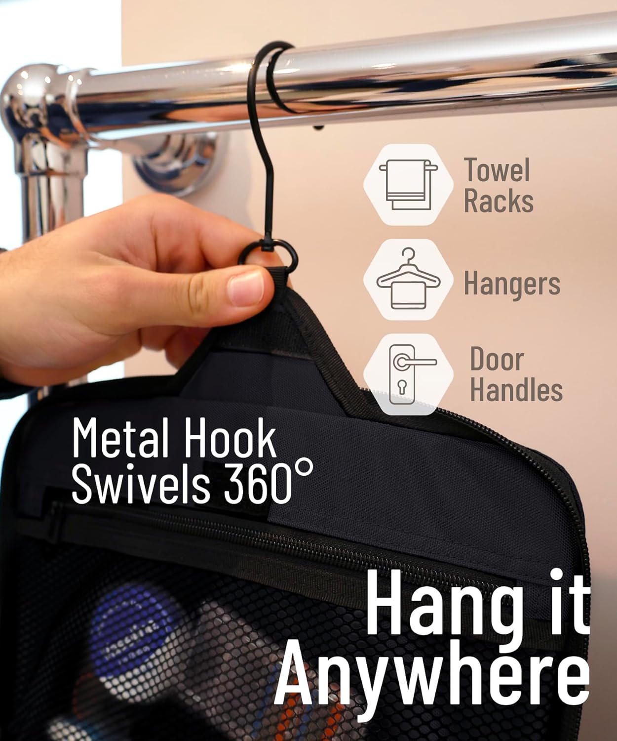- Convenient Hanging Hook: The XXL metal swivel hook allows you to hang the bag anywhere, saving valuable counter space. It's perfect for use in hotels, bathrooms, or even on a camping trip.