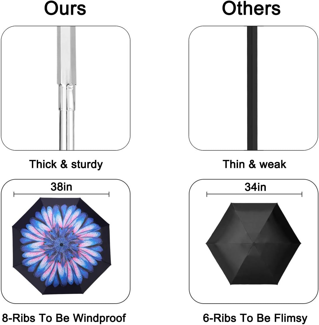 - ăUPGRADE STURDY & WINDPROOF UMBRELLA CONSTRUCTIONă- Unlike other mini umbrellas made of 6 ribs,our compact mini umbrella is made of 8 ribs.And the shaft is designed thicker than other ordinary 6 or 8 ribs umbrellas.So,this compact travel umbrella can withstand the normal heavy wind/rain and make sure that it won't easily to flip out inside easily.