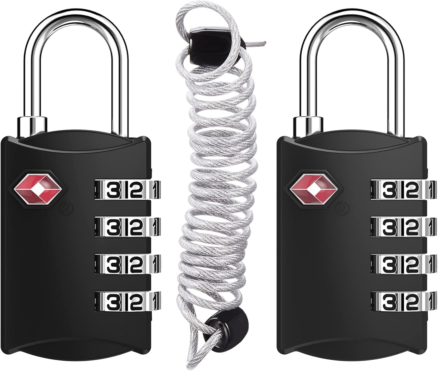 - EASY & SECURE: The resettable 4 digit combination luggage lock with cable allows you to set you own combination with 10,000 unique options, which is 10 times hard to crack than a 3-digit. Simple 6 steps instructions are included at the back of the package cardboard. Please note that NEVER forget your password or the luggage padlock will be of no use.