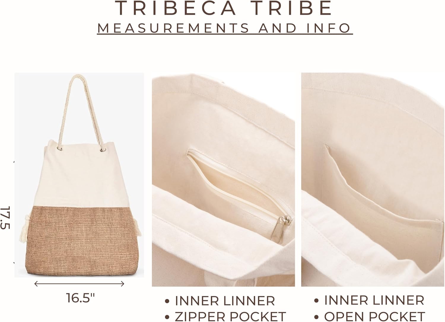 - Large but not bulky... a generous 16.5 x 17.5 x 4 inches, the Tribeca Tribe beach bag is a great place to stash your sunscreen, beach hat, after-sun, and don’t forget a good book