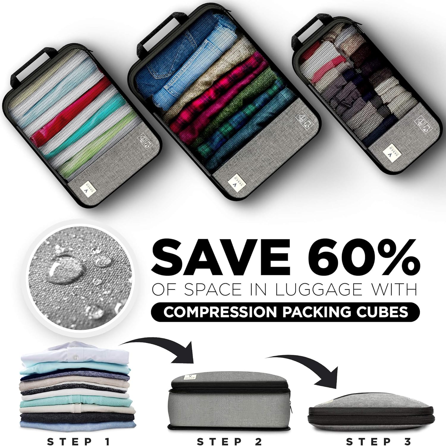 • GUARANTEE – With our 100% RISK-FREE SATISFACTION GUARANTEE on this compression packing cubes set you have got nothing to lose. However, we are quite sure that you would be impressed with the functionally effective design that combines the benefits of both, travel cubes & compression sacks, helps squash everything down to save space, looks stylish and the fact that it makes travel packing a breeze.