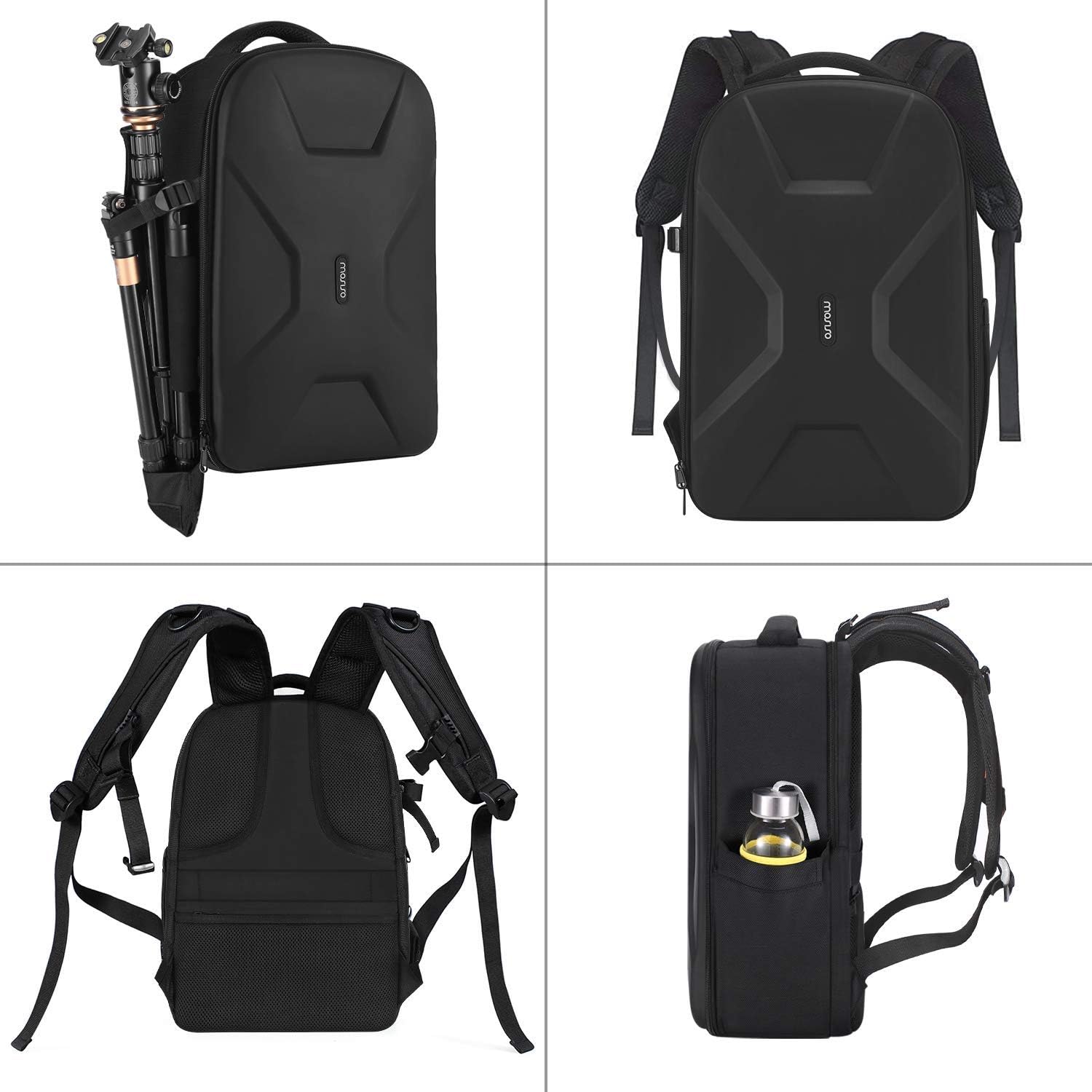 - Full open design. 2 accessory pockets on the back face can store cables, sd cards, powerbank and other small items. Tripod/monopod holder is featured with 1 secure strap on one bag side. 1 pocket on another side can store umbrella or water bottle(up to maximum 2.5 diameter). 1 anti-theft pocket is designed on the back for your wallet, cellphone and precious items.