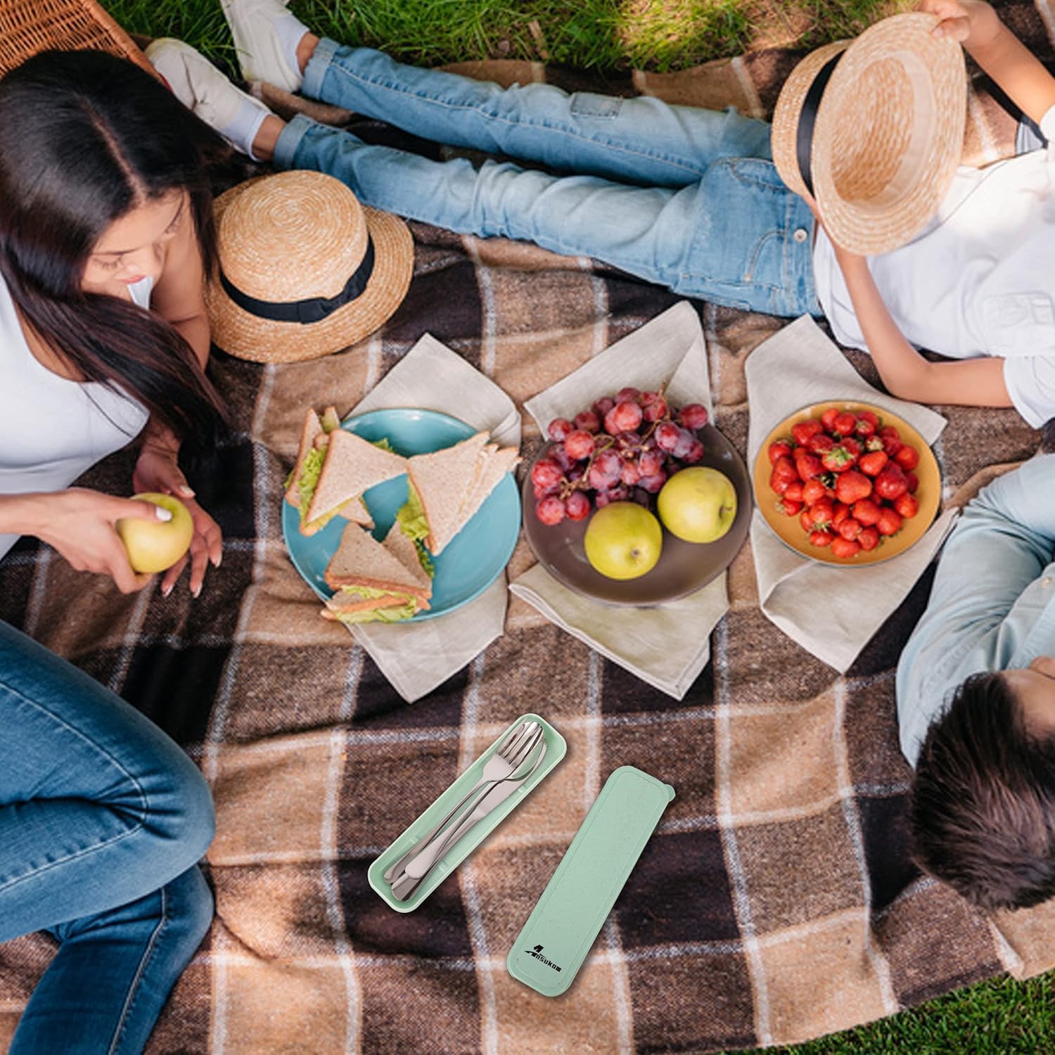 - Silverware set is made of 18/8 stainless steel (SUS 304). Doesn’t contain harmful metal, is corrosion-resistant and durable. The case is made of wheat straw and it's BPA free.The travel silverware set with case is made of high-quality food-grade stainless steel, which is sturdy and durable .Travel cutlery setis not easy to bend or deform after long-term use, is heat-resistant, reusable, and does not rust