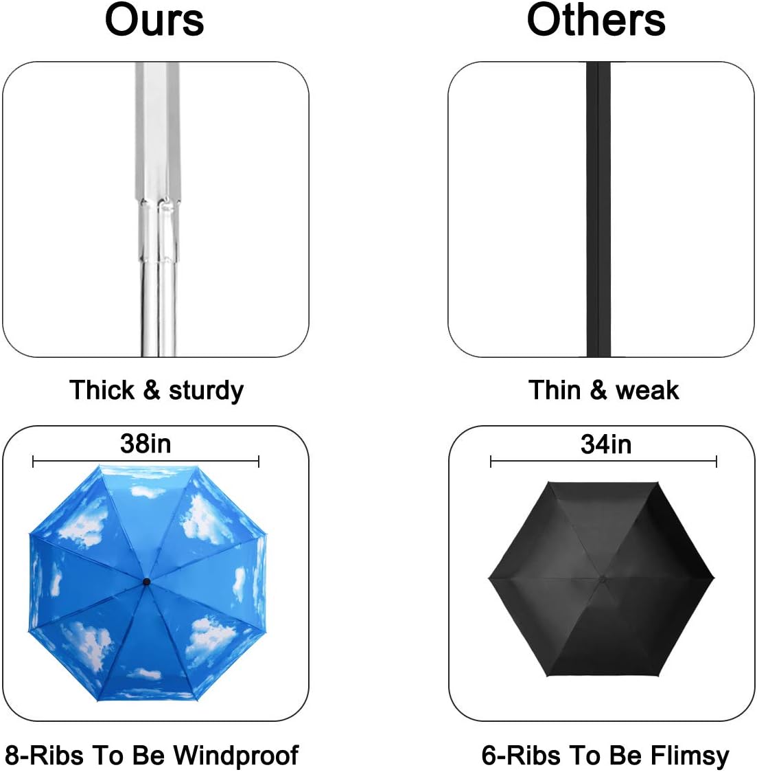 - ăUPGRADE STURDY & WINDPROOF UMBRELLA CONSTRUCTIONă- Unlike other mini umbrellas made of 6 ribs,our compact mini umbrella is made of 8 ribs.And the shaft is designed thicker than other ordinary 6 or 8 ribs umbrellas.So,this compact travel umbrella can withstand the normal heavy wind/rain and make sure that it won't easily to flip out inside easily.