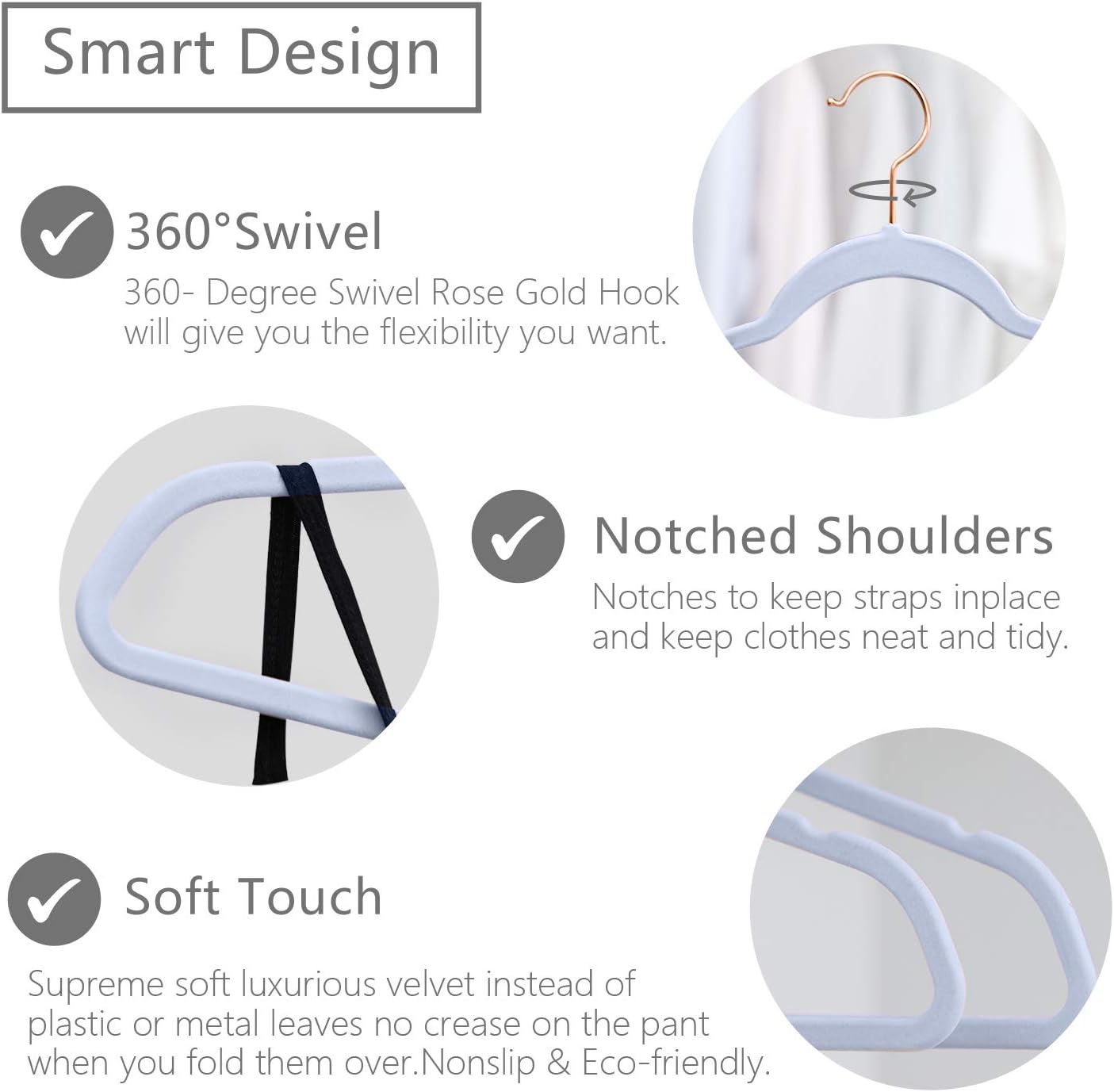 - SWIVEL ROSEGOLD HOOKS - can be 360 degree rotated, which easy sorting of clothes no matter which direction you hang your clothes, strongly attached to our durable hanger so the hook doesn't detach or snap easily