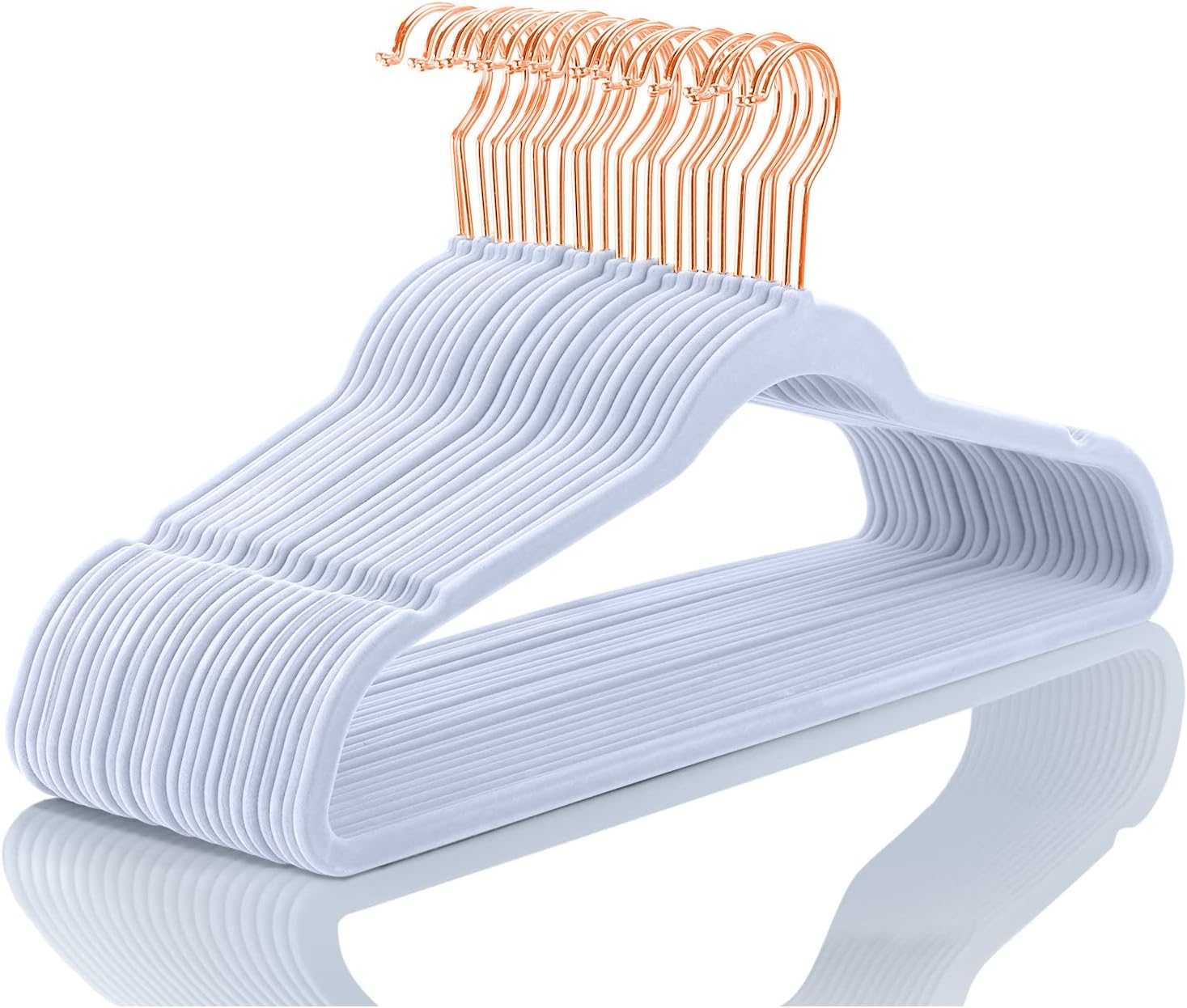 MIZGI Premium Velvet Hangers (50 Pack) Heavy Duty - Non Slip Felt Hangers - Velvet Suit Hanger Light Blue - Rose Gold Hooks,Space Saving Clothes Hanger