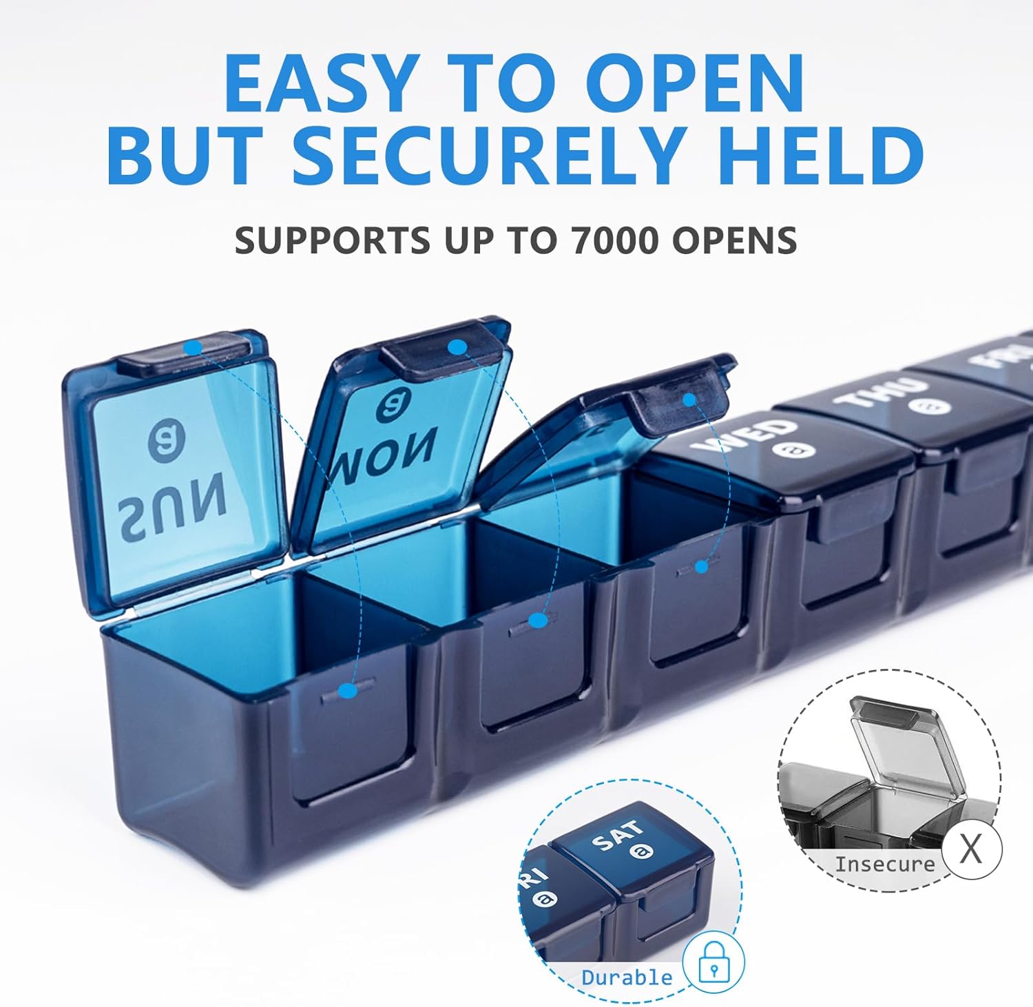 - EASY-TO-READ & DURABLE PRINTING: This 7 day pill organizer features bold, high-quality day markings that remain clear and legible even after long-term use. The upgraded printing resists fading and rubbing off, making it easy to track your pills every day without worrying about wear or peeling.