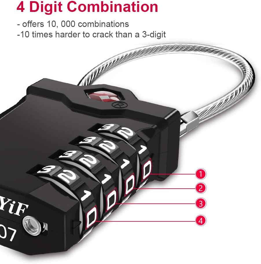 - SECURE & SOLID: The resettable 4 digit cable luggage lock allows you to set you own code with 10,000 options. It is 10 times harder to crack than a 3 digit. The heavy duty TSA cable lock come with solid, compact body made of high strength zinc alloy. It is tough enough to survive even the roughest baggage handling. The feature opening by sliding is advanced and unique among TSA lock long on the market, highly resistant to technical and violent unlocking.