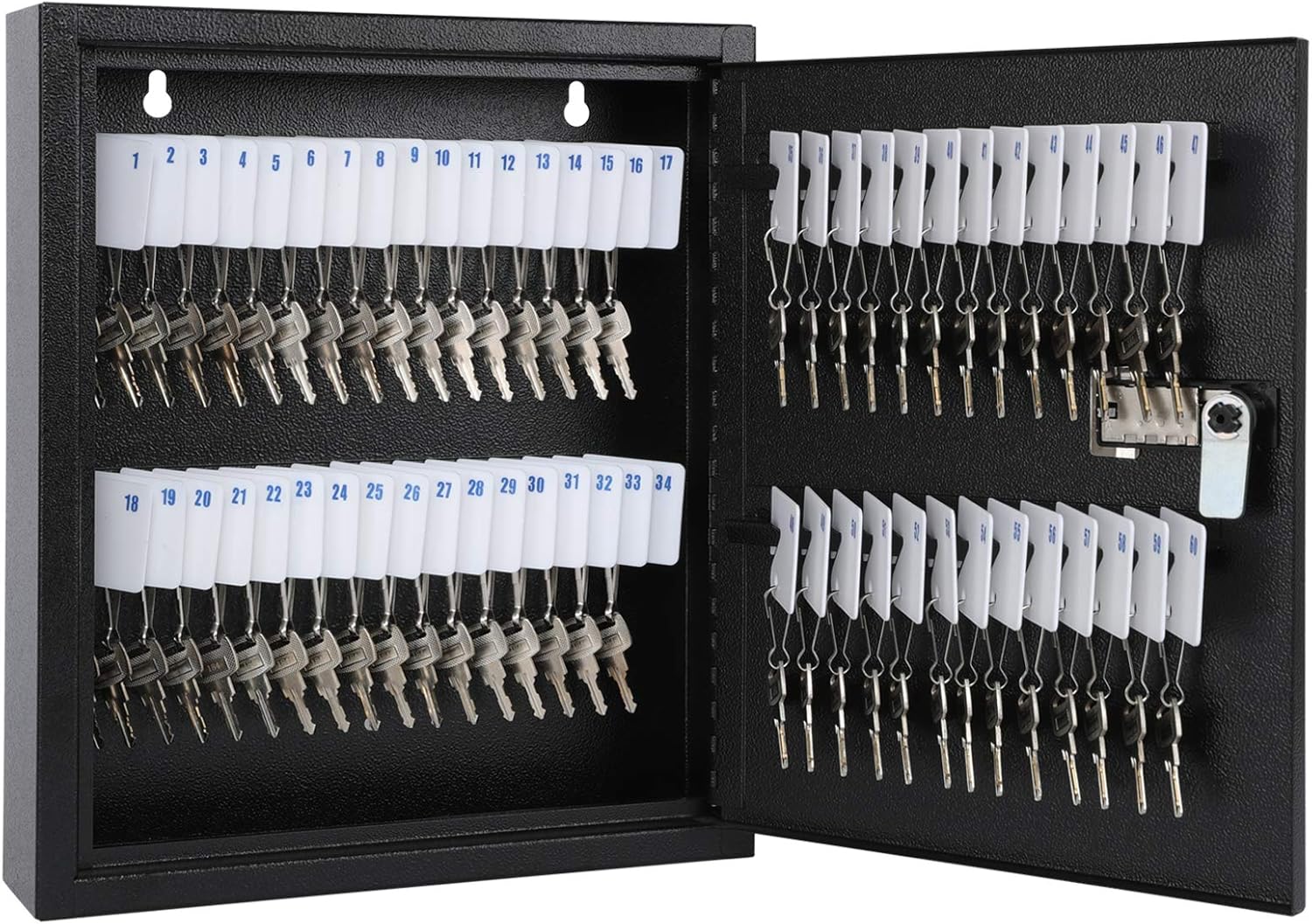 - KEY STORAGE BOX : Keep keys security Key lock box includes 60 key rings, identification tags, and a key labels. Size: 2.5"D x 10.2"W x 12.1"H