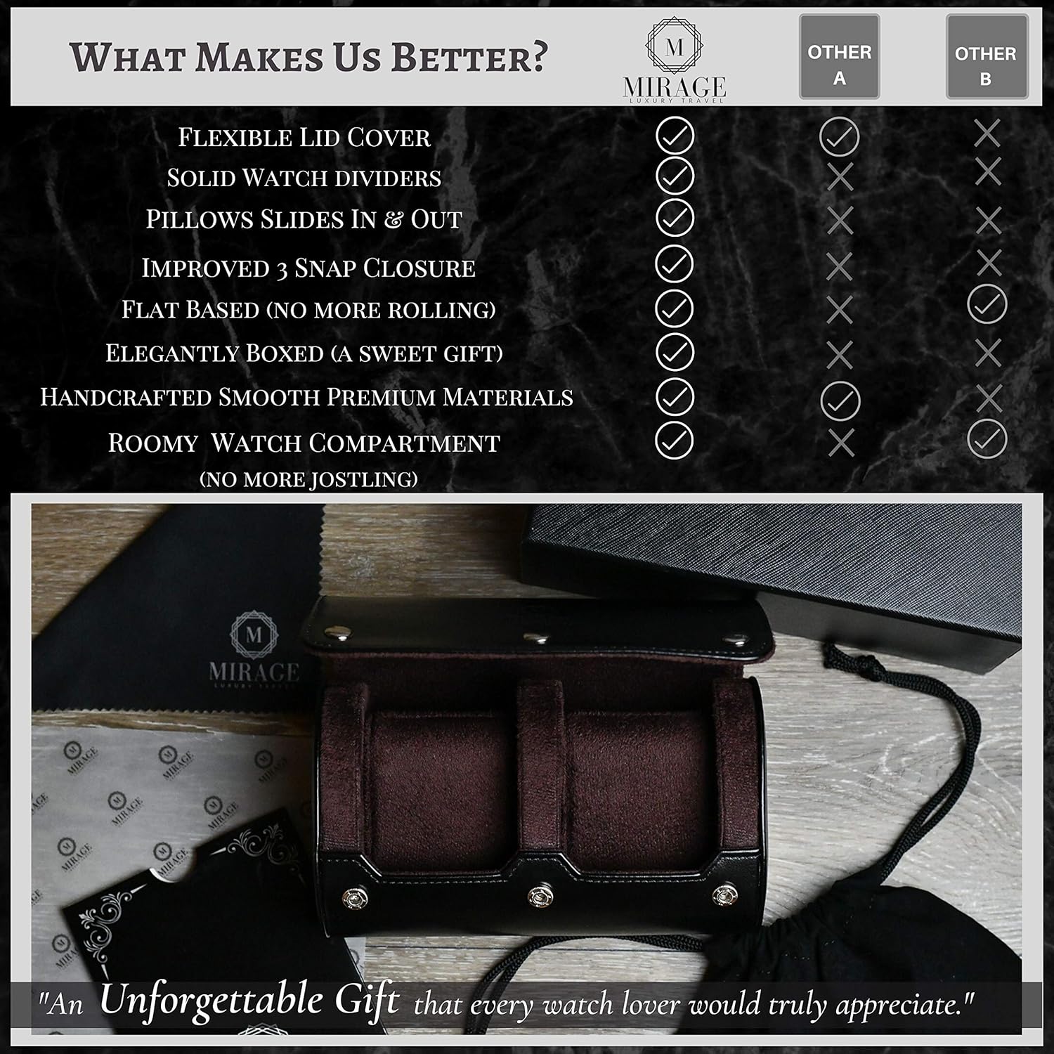 - ⌚️ ORIGINALLY DESIGNED BY MIRAGE LUXURY TRAVEL - We are the proud creator of this unique travel watch roll leather Swiss-inspired design, as our reviews will attest. Elegantly handcrafted watch cases for men made from top-grade vegan leather. Featuring accent stitching for added elegance, button closure for superior protection, and a luxurious soft-touch inner suede lining.