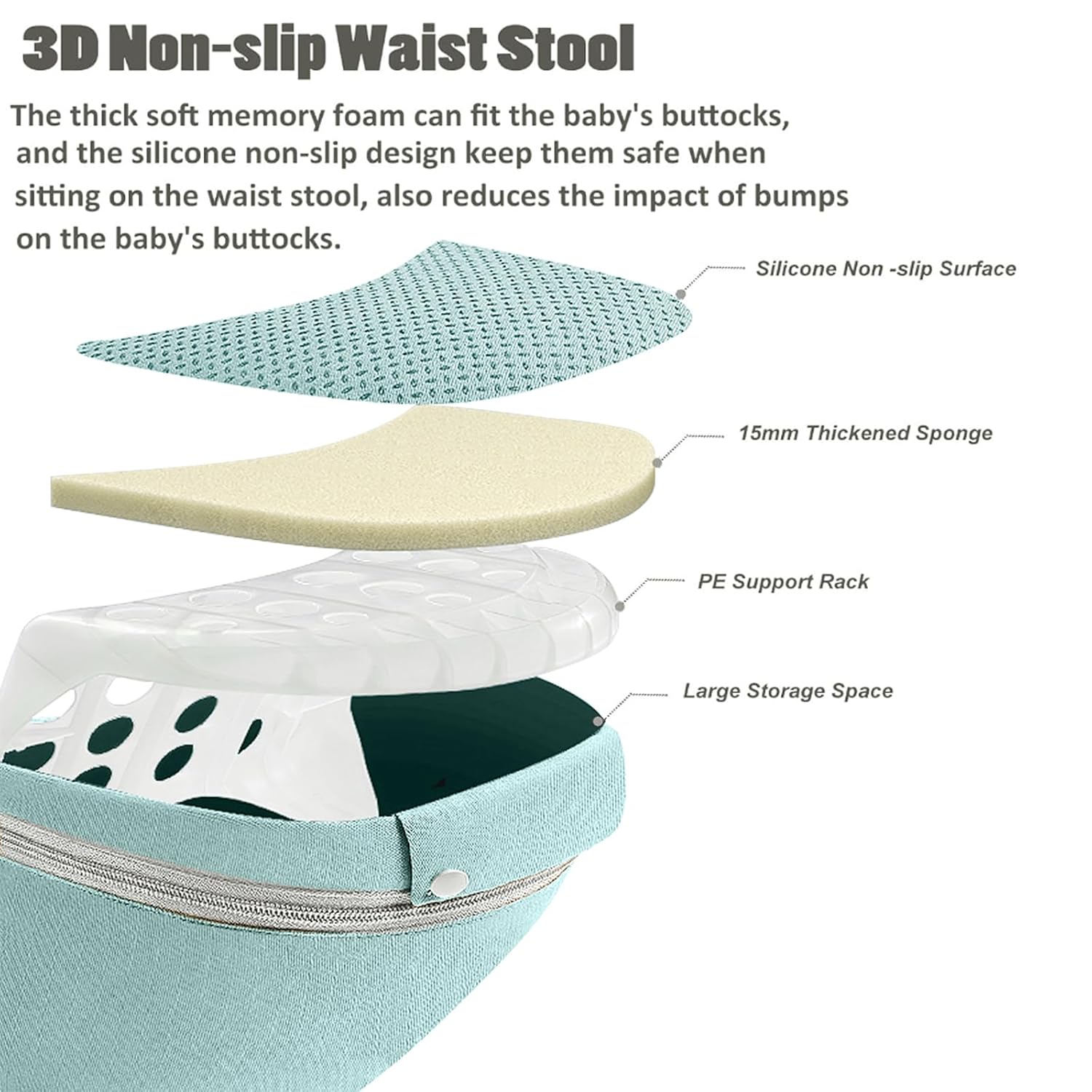 - Ergonomic Hip Seat: The waist stool maintains the baby's M-shape during carrying, helping their skeletal development. The wide waistband make the hip seat to fit snugly against the parent's waist, helping to share the weight during carrying baby. The inward sloping angle of the hip seat keeps the baby close to the parent's body comfortably and reduces bumps and shaking when parents walking. Besides, it make baby feel safety in their arms.