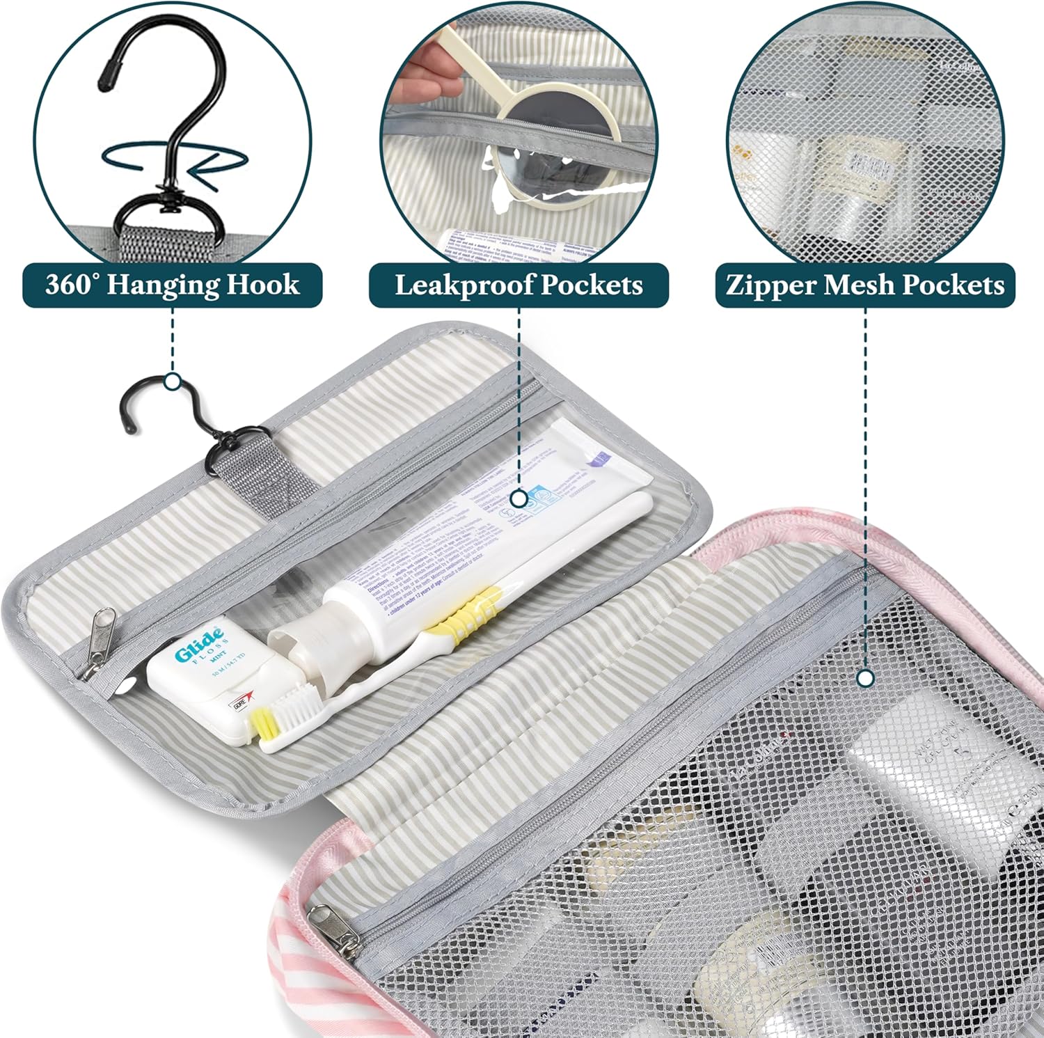 PAVILIA Hanging Toiletry Bag Travel Bag Women Men, Foldable Cosmetic Organizer, Roll up Makeup Bag, Water Resistant Accessories Toiletries, Large Travel Essentials Kit (Pink Stripe)