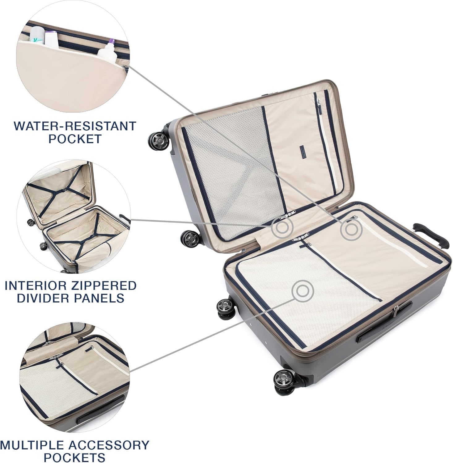 - ORGANIZED TRAVEL: Check-in hardside luggage has interior zippered divider panels keep contents organized, separated and secured in place. Interior water-resistant pocket provides packing versatility for damp items or toiletries