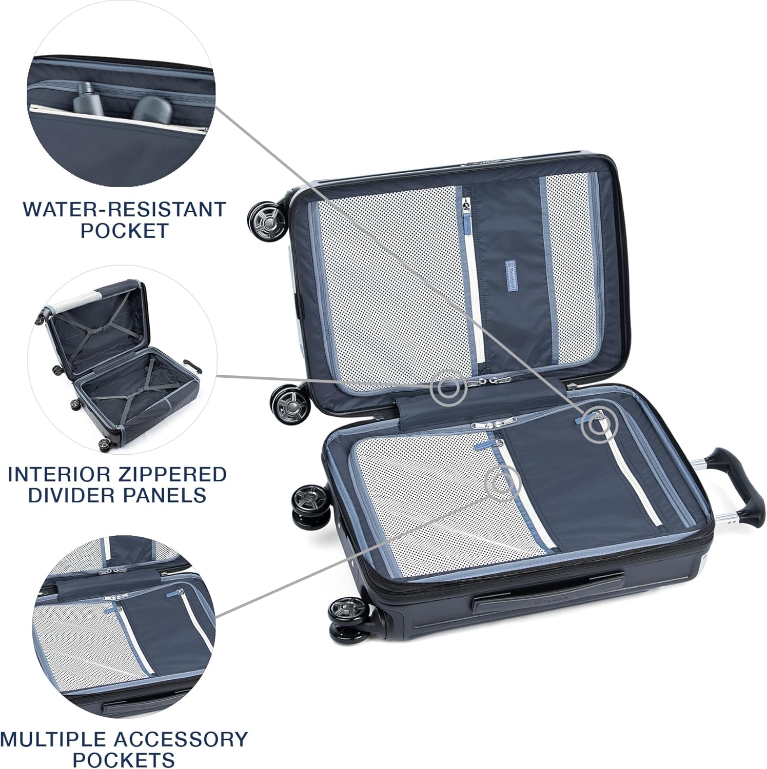 - ORGANIZED TRAVEL: Check-in hardside luggage has interior zippered divider panels keep contents organized, separated and secured in place. Interior water-resistant pocket provides packing versatility for damp items or toiletries