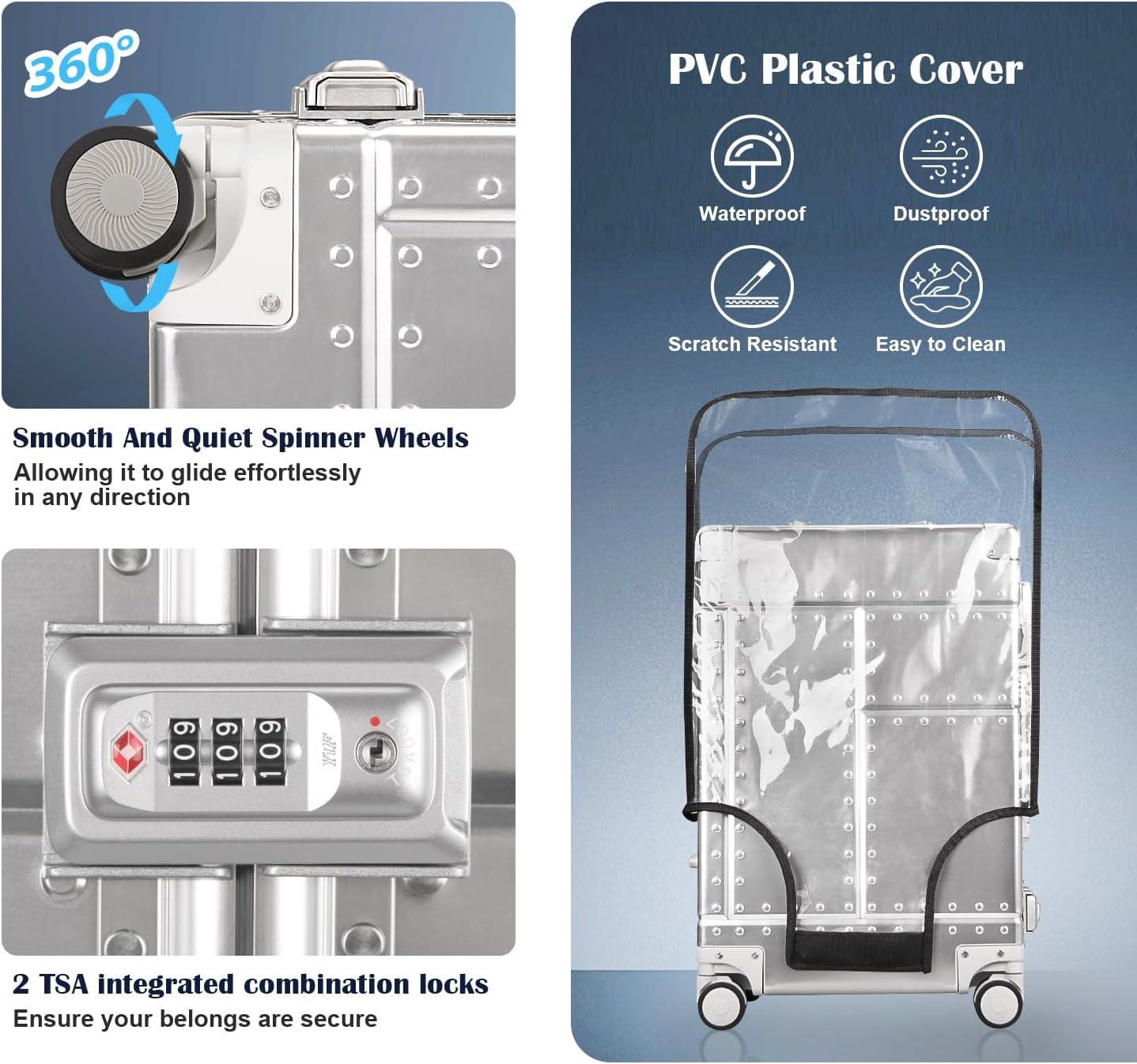 - 【Safety And Convenient TSA Lock 】: Equipped with 2 combination locks, which can give you peace of mind when traveling because you can ensure your belongs are secure. Its aluminum hard shell enables a zipper-free construction, while the lock in combination added security. Different from traditional zipper styles, the lock effortlessly unlocks just need a simple push. The luggage can easily be inspected by airport security.