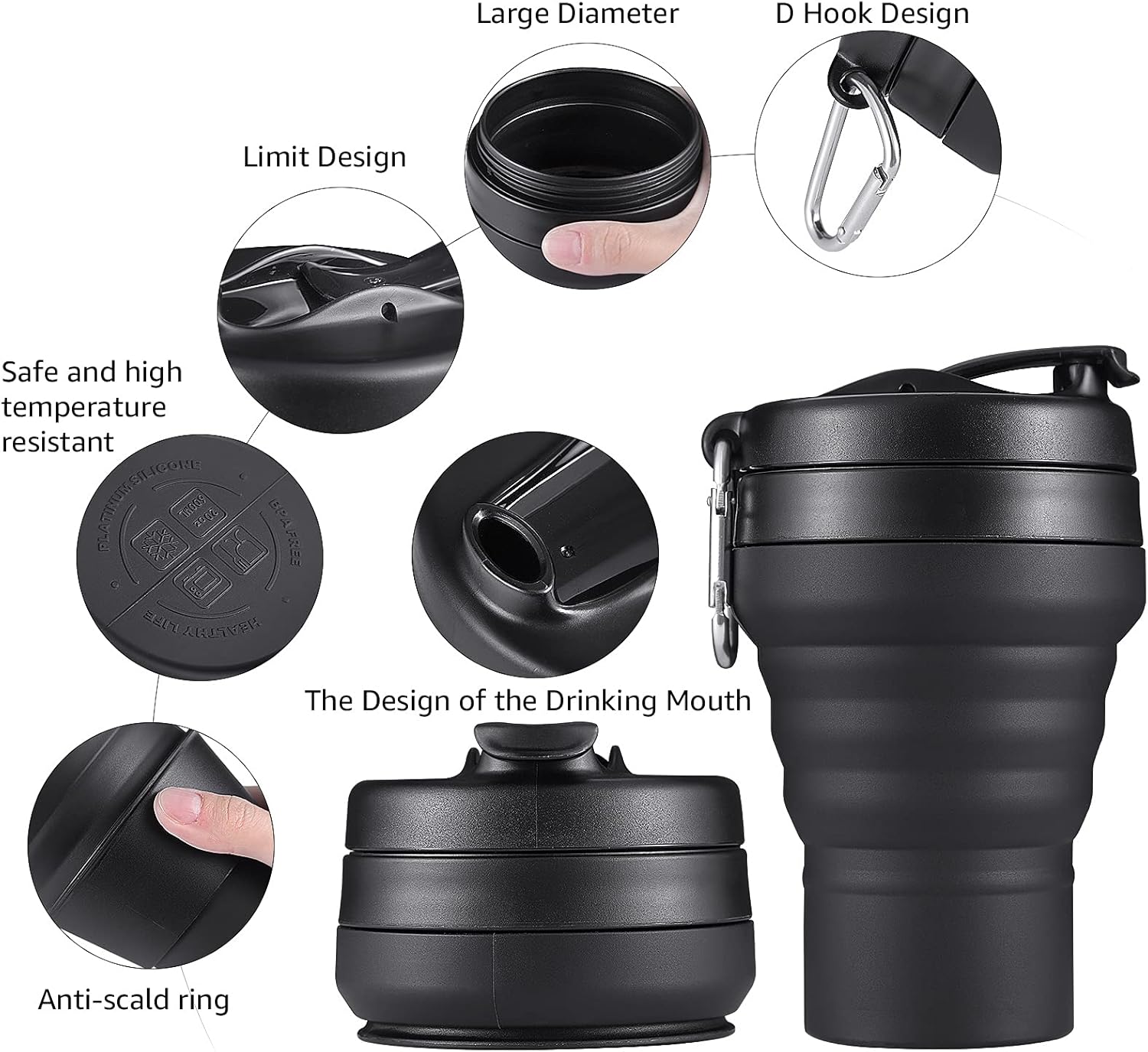 2PACK Collapsible Coffee Cup, 20 OZ 600ml Silicone Folding Camping Mug, Leak Proof BPA Free Portable Sport Bottle with Lids for hiking, Microwave & Dishwasher Safe (Black)
