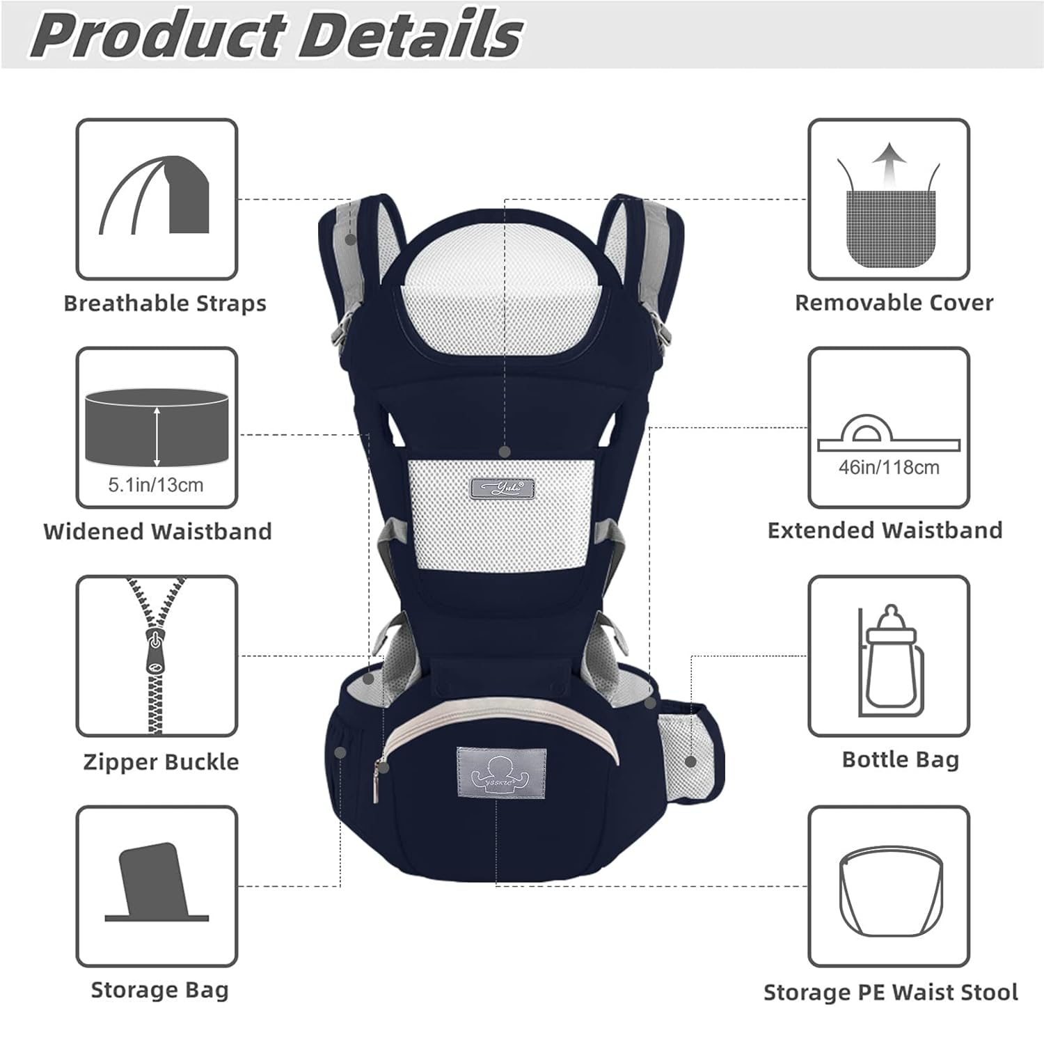 - Convenient Design: The baby carrier has a variety of convenient and personalized designs, like the Velcro waistband can easily adjust the elasticity. Pockets on both sides of the waist are convenient for storing milk bottle, phone, keys, etc. The inner liner of the hip seat can be taken out and can be directly put into the washing machine for cleaning. YSSKTC not only care about the baby's feelings, but also consider the needs of the parents.
