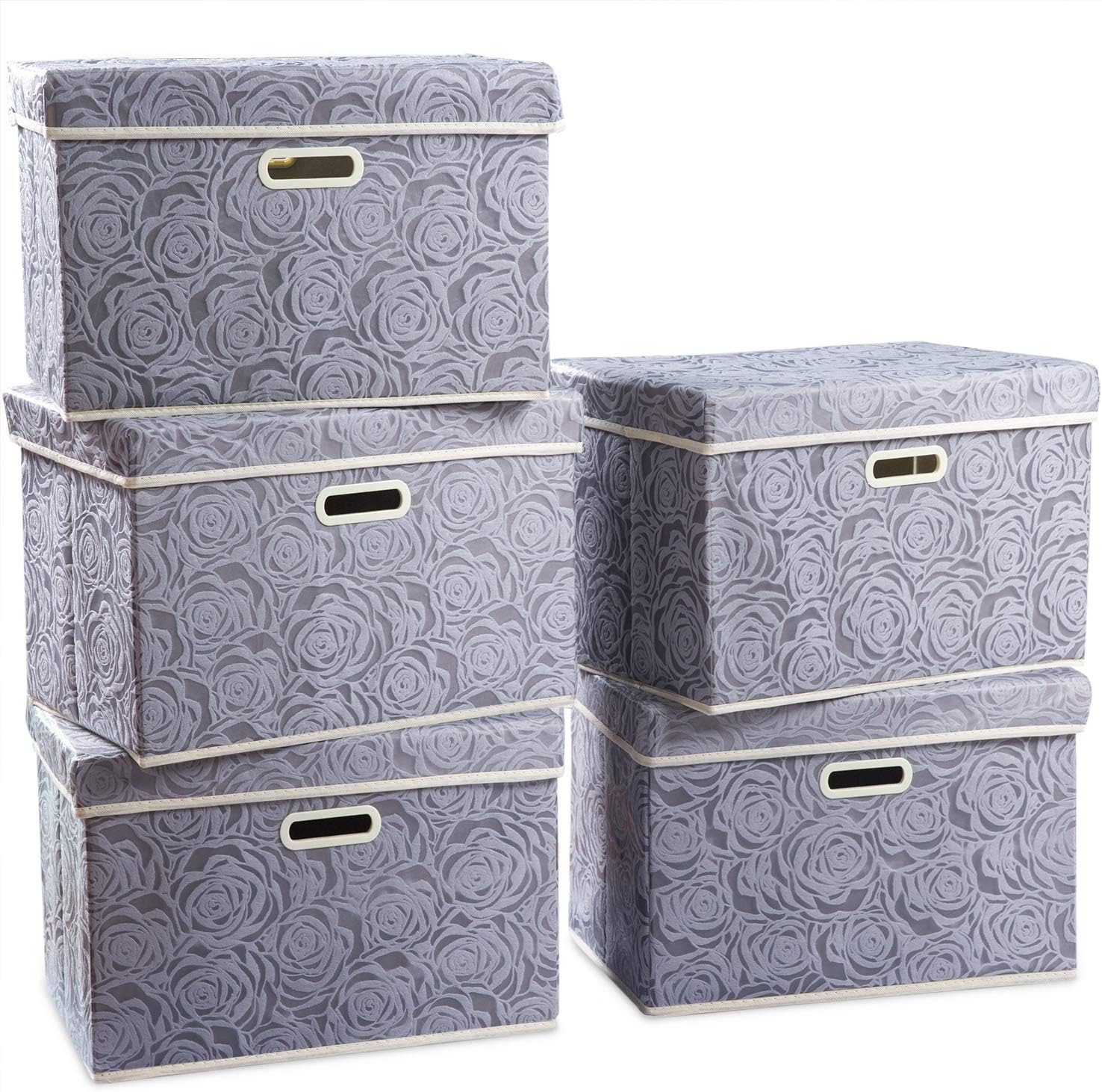 PRANDOM Large Storage Boxes with Lids [5-Pack] Fabric Decorative Storage Bins Cubes Organizer Containers Baskets with Handles for Closet Grey 17.5x11.8x11.8 In For 6+ Year Old Boys and Girls