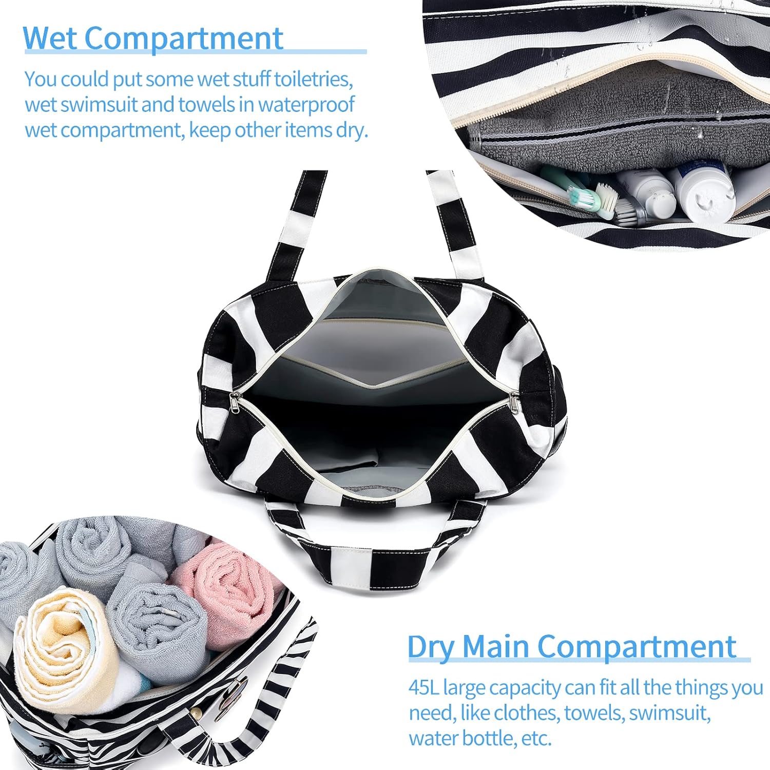 - Wet Pocket: Unlike other beach tote bag, this one is up-graded with separate waterproof wet compartment which you can put into some wet stuff Toiletries, wet swimsuit and towels, keep other items dry all the day.