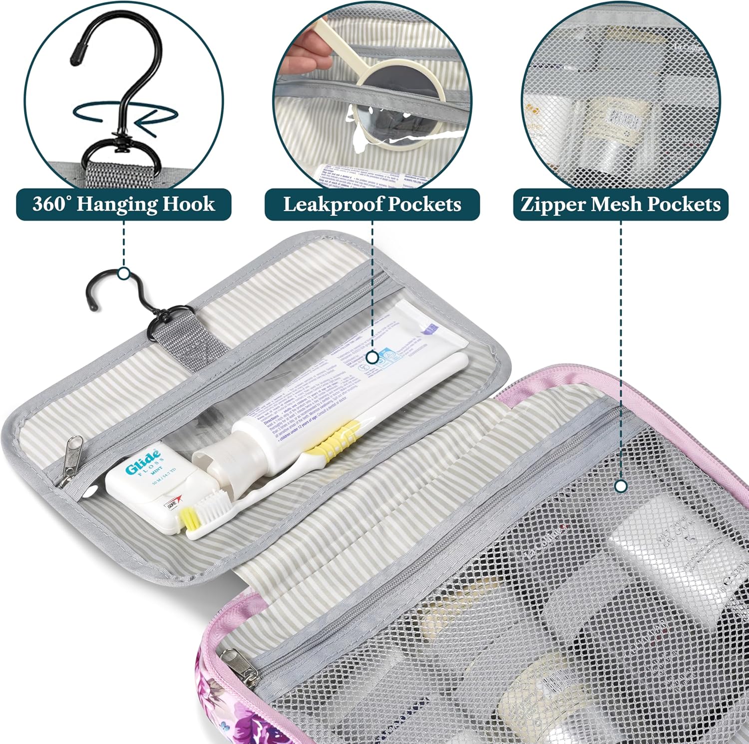 - HANGING COSMETICS TRAVEL BAG ORGANIZER: This toiletry bag for women has a hanging hook and multiple pockets that help you stay organizer during business trip, vacation travel. The hanging hook makes it easy to hang the toiletry bag to bars in the hotel shower bathroom. Unzip your toiletry bag to reveal compartments to organize your shampoo, skincare face hygiene products. This toiletry travel bag is an essential accessory for cruise in Europe, plane, Hawaii Trip, and honeymoon.