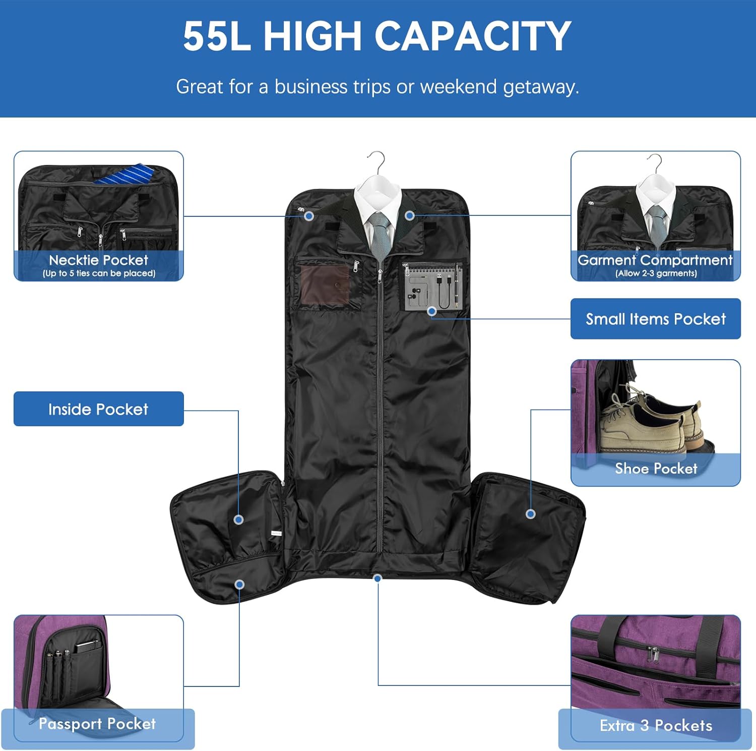 - Multifunctional Structure: Our large garment bag is designed with 13 compartments, capacity: 55L. With multiple zipper pockets, it maximizes storage capacity, holding everything from suits, dresses, shoes, ties, and other belongings. Also, 4 anti-theft front pockets for your frequently used belongings and provides easy access to electronics and travel or business documents. This garment travel bag has been designed to keep everything you need well-organized on the go.