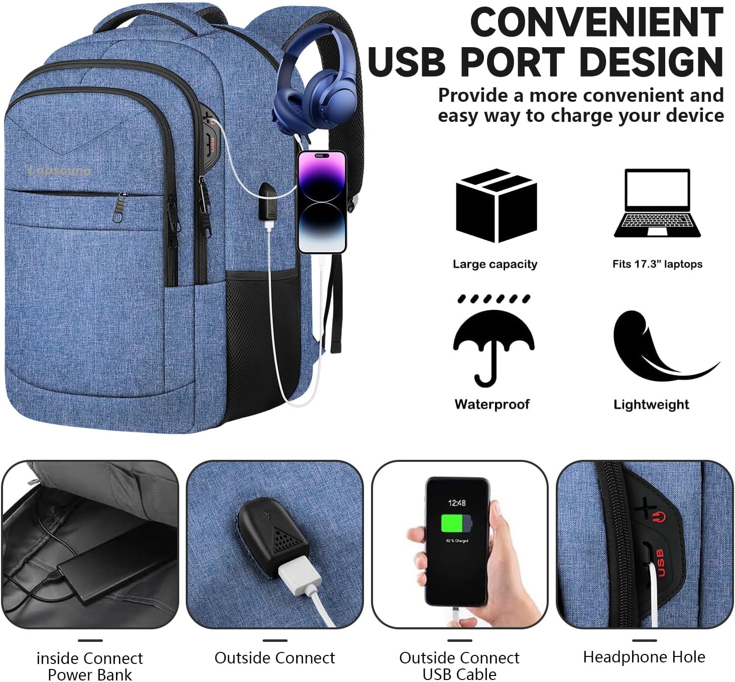 Lapsouno Extra Large Travel Backpack, TSA Laptop Backpack, 17 inch Bag with USB Port, 40L Carry on College School Computer Bag for Men Women, Blue
