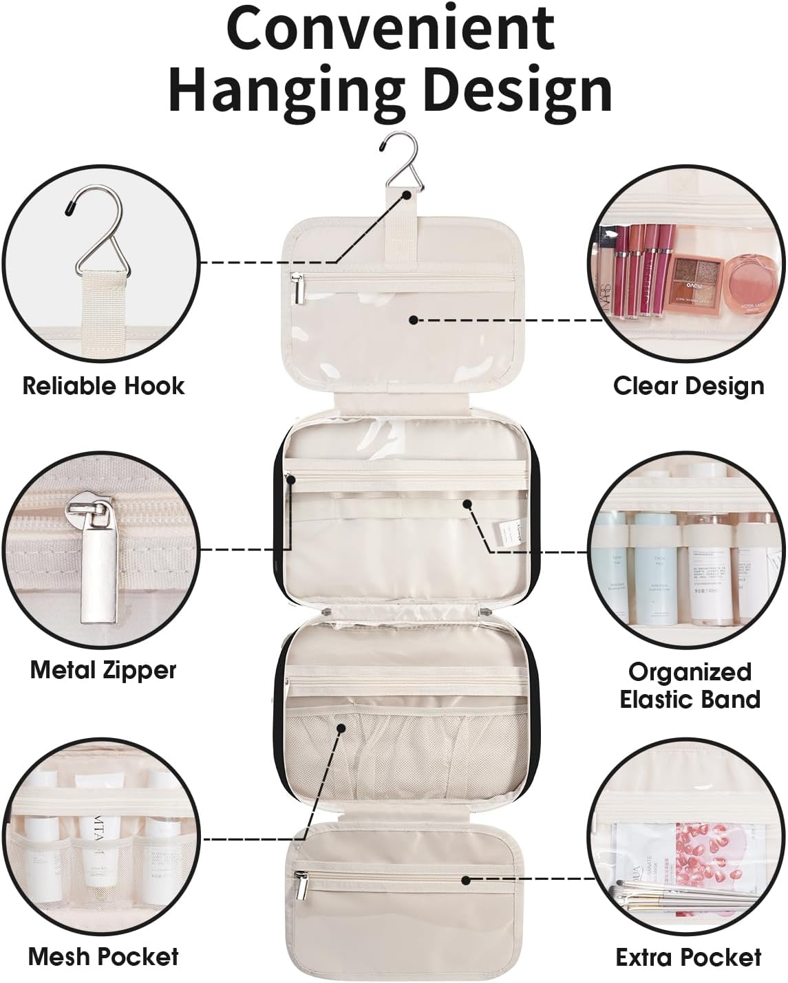- Hanging metal hook allows displaying bag on towel racks or hooks for easy access