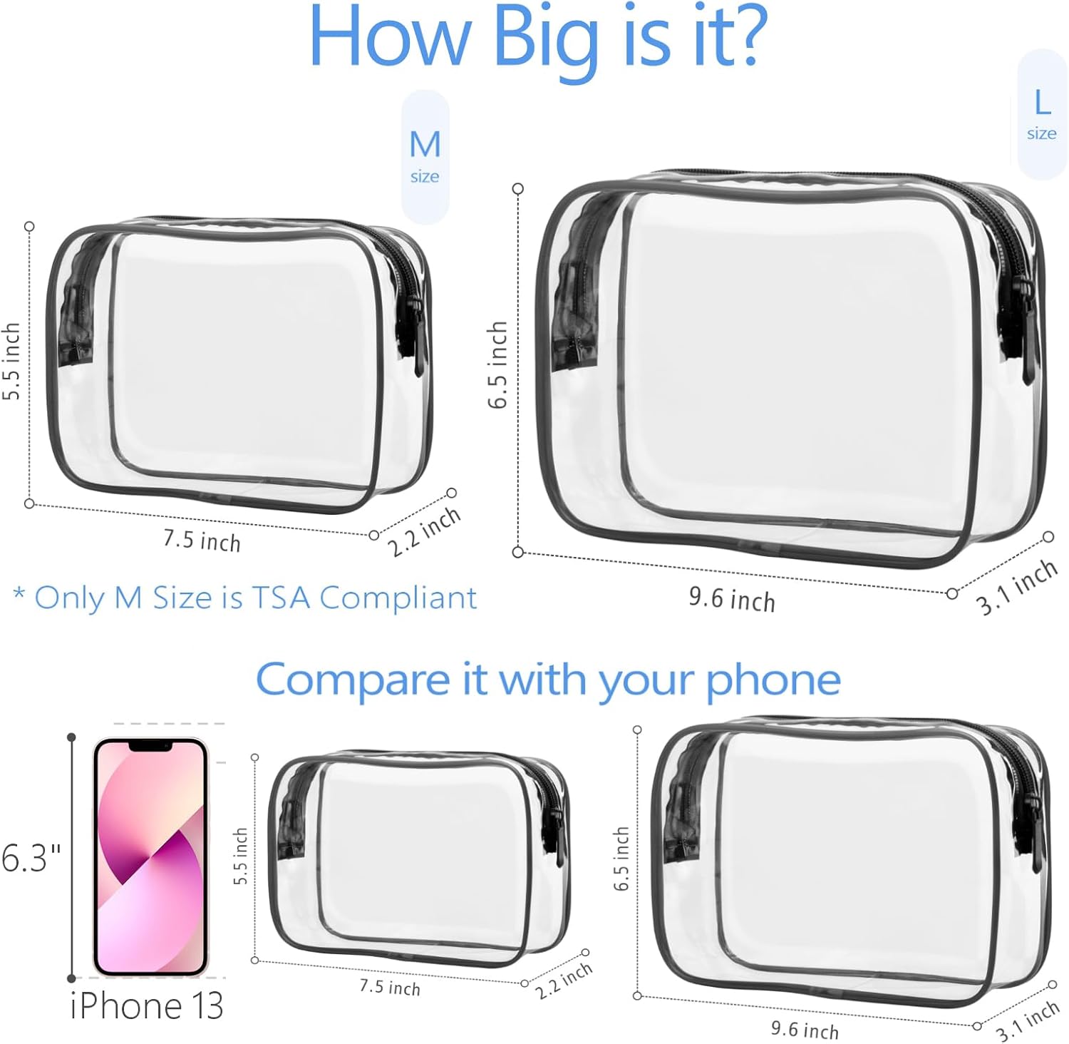 - TSA Approved, Meet Liquids Rule: The medium size clear makeup bag is 7.5 x 2.2 x 5.5 inch, it follows the TSA's 3-1-1 Liquid Rule published by TSA. You can quickly pass the airport security screening. Note: the large size clear bag is 9.6 x 3.1 x 6.5 inch, it is larger than one quart and is not TSA approved