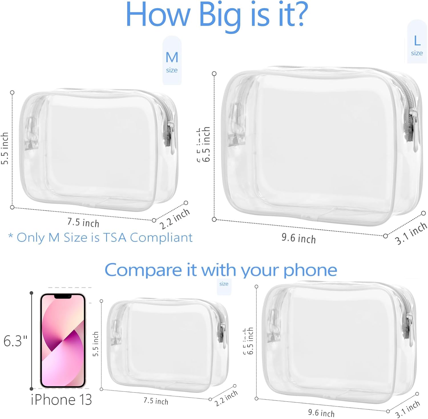 - TSA Approved, Meet Liquids Rule: The medium size clear makeup bag is 7.5 x 2.2 x 5.5 inch, it follows the TSA's 3-1-1 Liquid Rule published by TSA. You can quickly pass the airport security screening. Note: the large size clear bag is 9.6 x 3.1 x 6.5 inch, it is larger than one quart and is not TSA approved