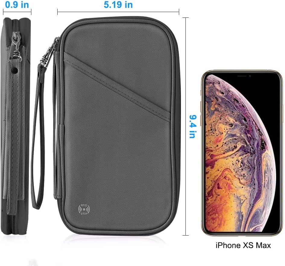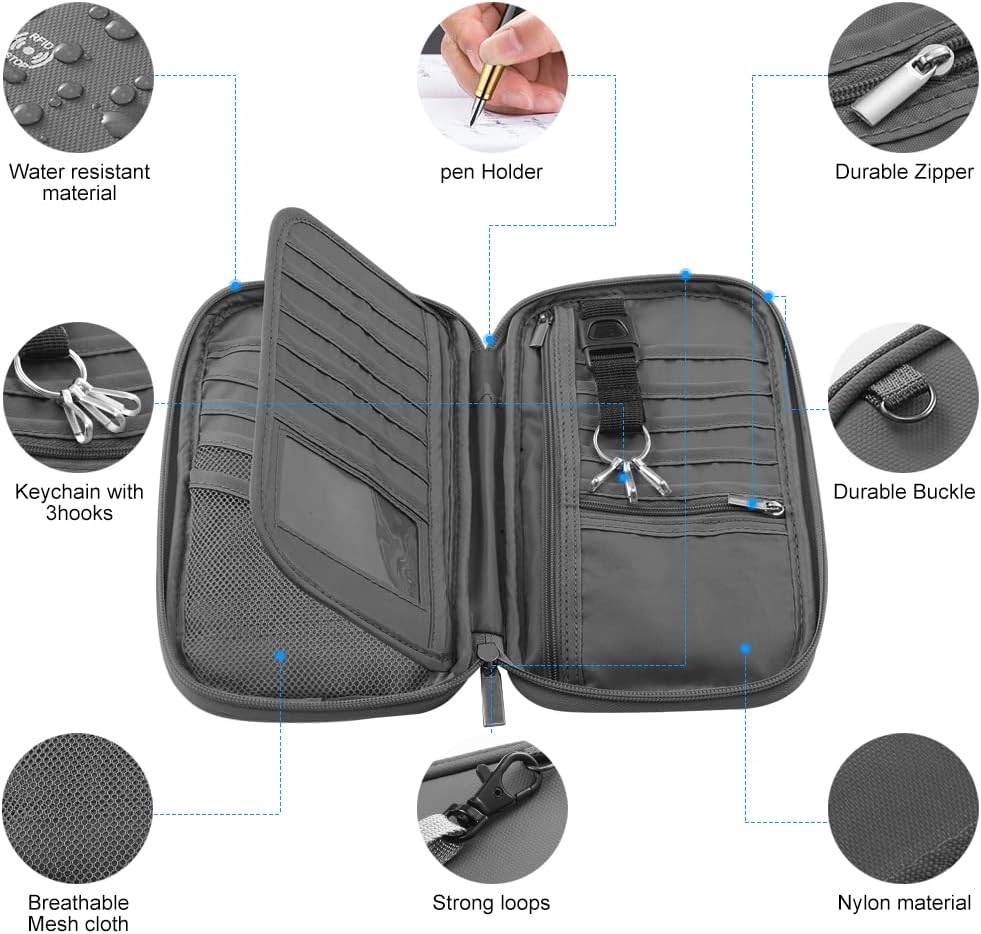 - 【LARGE CAPACITY ORGANIZER】The RFID Universal Travel Passport Wallet organizer with RFID essentials well, Storing 5 * Passport holder, 1 * brochure, 9 * Credit Cards, Keychain with 3 hooks, Boarding Card, Tickets, ID Card, Coins, loose money, License, other documents, etc. Large zipper pocket for cash and pen slot on the middle, Front Pockets could easy access to phone/boarding cards, which makes your journey convenient and comfortable.