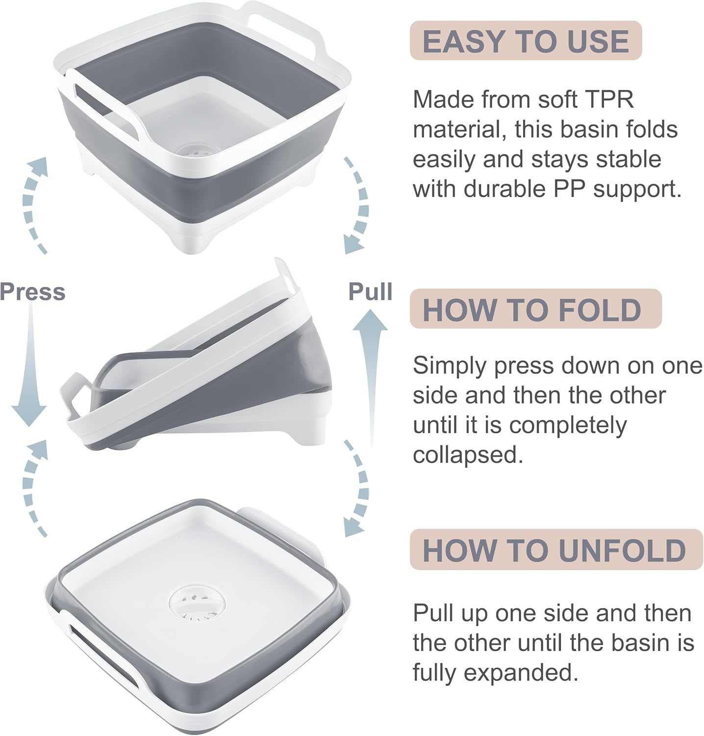 2.4 Gal(9L) Collapsible Dish Basin with Drain Plug - Multiuse Foldable Wash Basin for Baby Bottles, Space-Saving Multiuse Dish Tub, Kitchen Sink for Camping, Dishes Washing, RV (Gray)