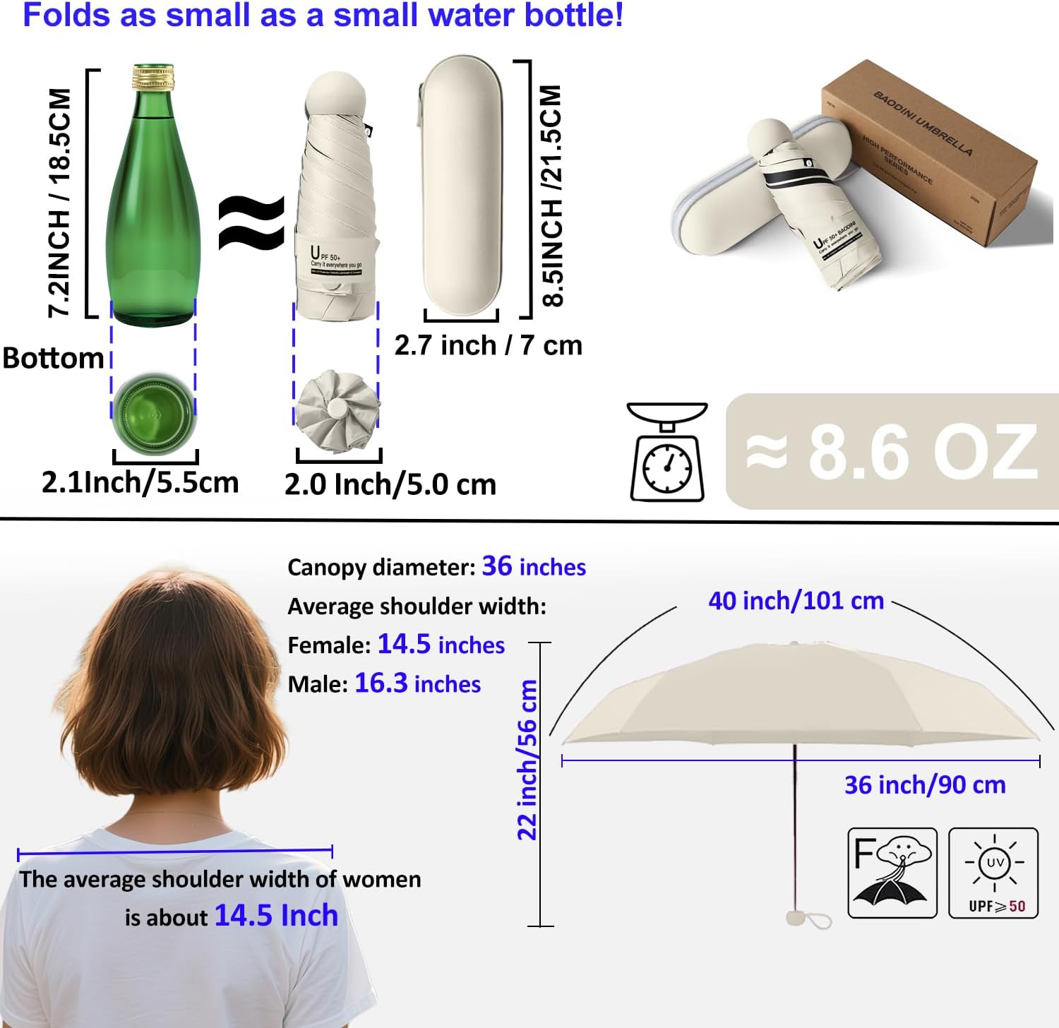 - Pocket umbrella: With a 40-inch arc and a 35.4-inch diameter, this mini travel umbrella is perfect for concealing in your purse or bag when you’re on the go! Folds to an ultra-compact 6.9 inches, makes the umbrella great for travel, as this super lightweight umbrella collapses about the size of your palm