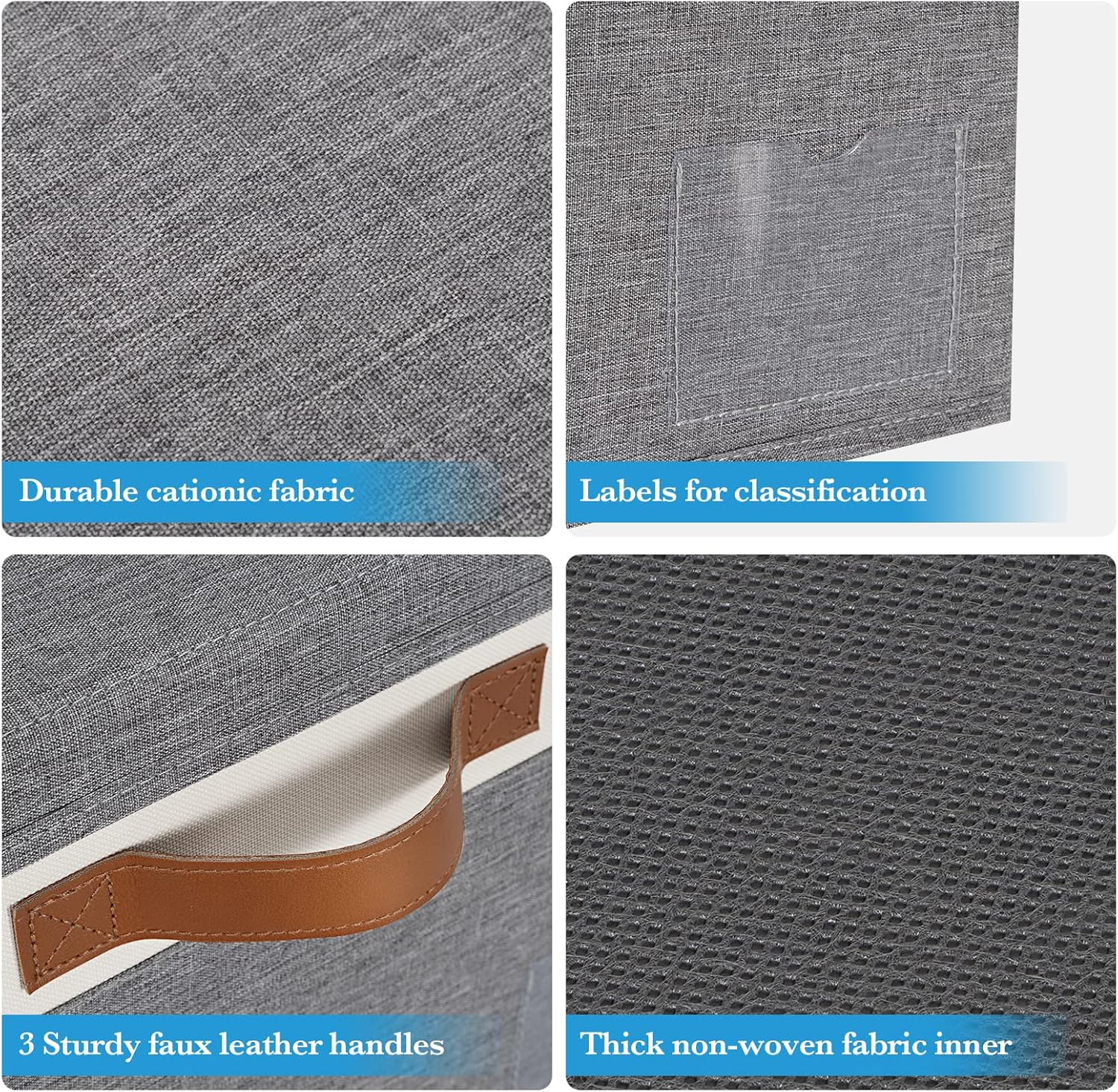 - 【Convenient Design】This storage bins with lids comes with 3 sturdy faux leather handleson, strong handles convenient for you to pull out the storage bins from the shelves and easy carry to everywhere. Each large storage bins with lids has an label, you can quickly categorize items and reduce the hassle of searching for what you need..Trust us to provide you with a practical and convenient storage solution that will simplify your life.