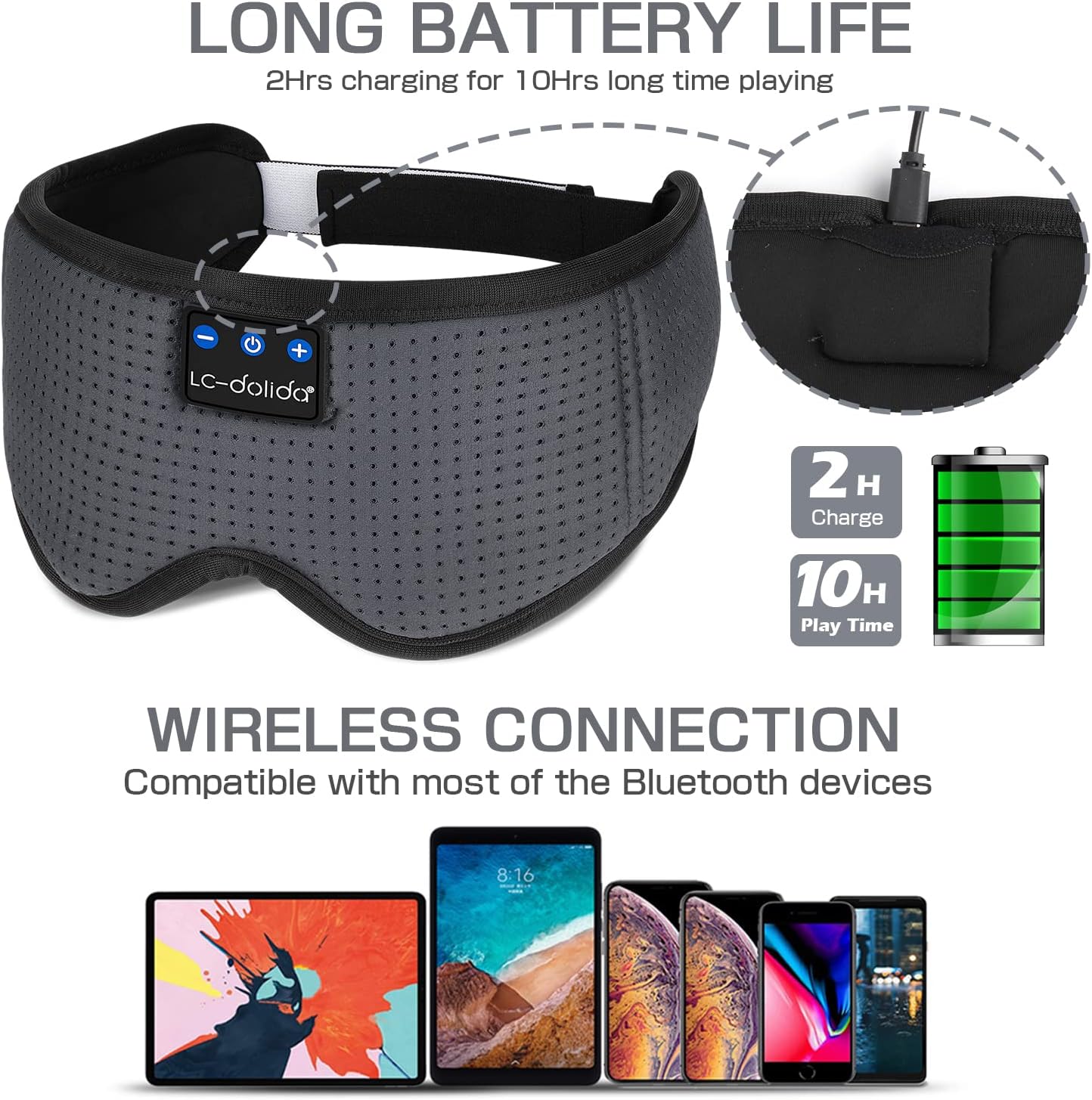 - 【Perfectly Block Out Light & Wireless Connection】LC-dolida Sleep headphones sleep mask with bluetooth headphones has a full coverage and unique nose area design, it can effectively block out light, prevent light leakage and makes your sleep better, Get the benefits of total blackout, whether at home, in a hotel or on the plane. The breathable, fibers of hypoallergenic material allows healthy oxygen in while keeping dry air out, which make you fall asleep faster