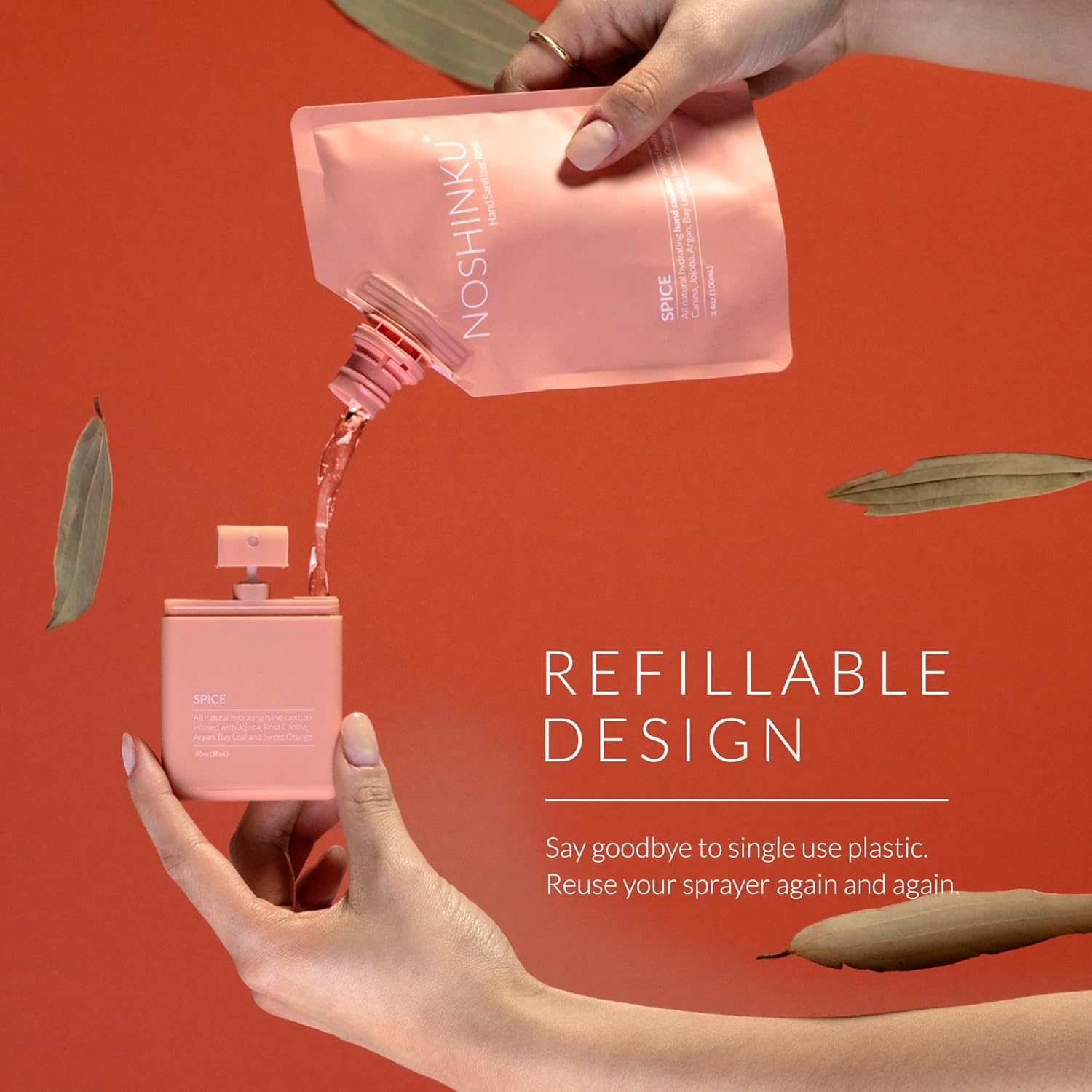 - REFILLABLE POCKET SPRAYERS: Includes 3 refillable pocket hand sanitizer infused with blood orange, spiced coriander, and herbaceous bay leaf essential oils. Each premium soft-touch travel hand sanitizer delivers 300+ sprays and helps reduce plastic waste with our eco-conscious refill system.