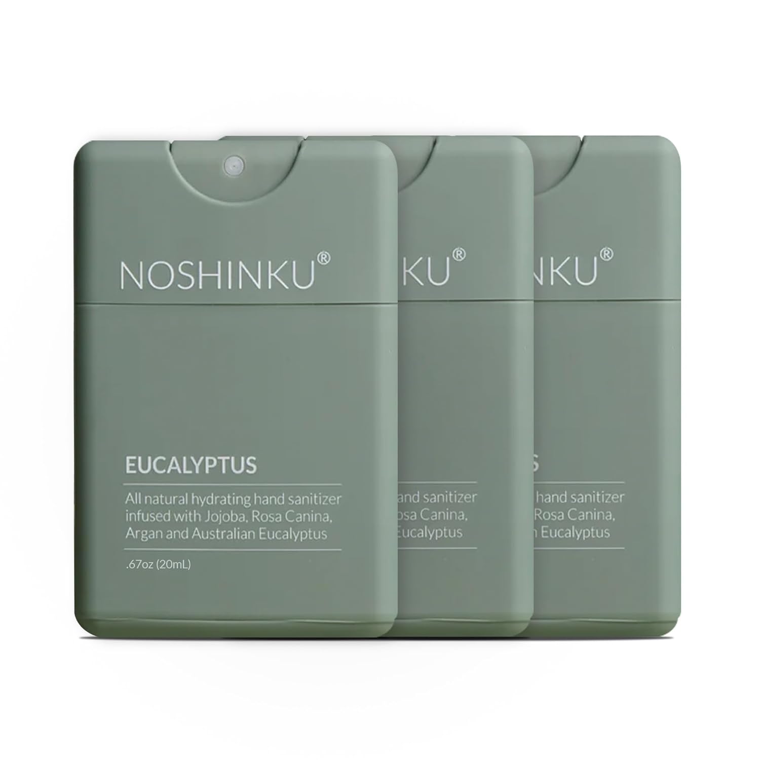 Noshinku - Refillable Hand Sanitizer Eucalyptus 3-Pack, Travel Size Spray with Hydrating Botanical Oils, Natural Ingredients, All Natural Fragrances, Sugarcane Derived Alcohol, No Parabens, No Dyes