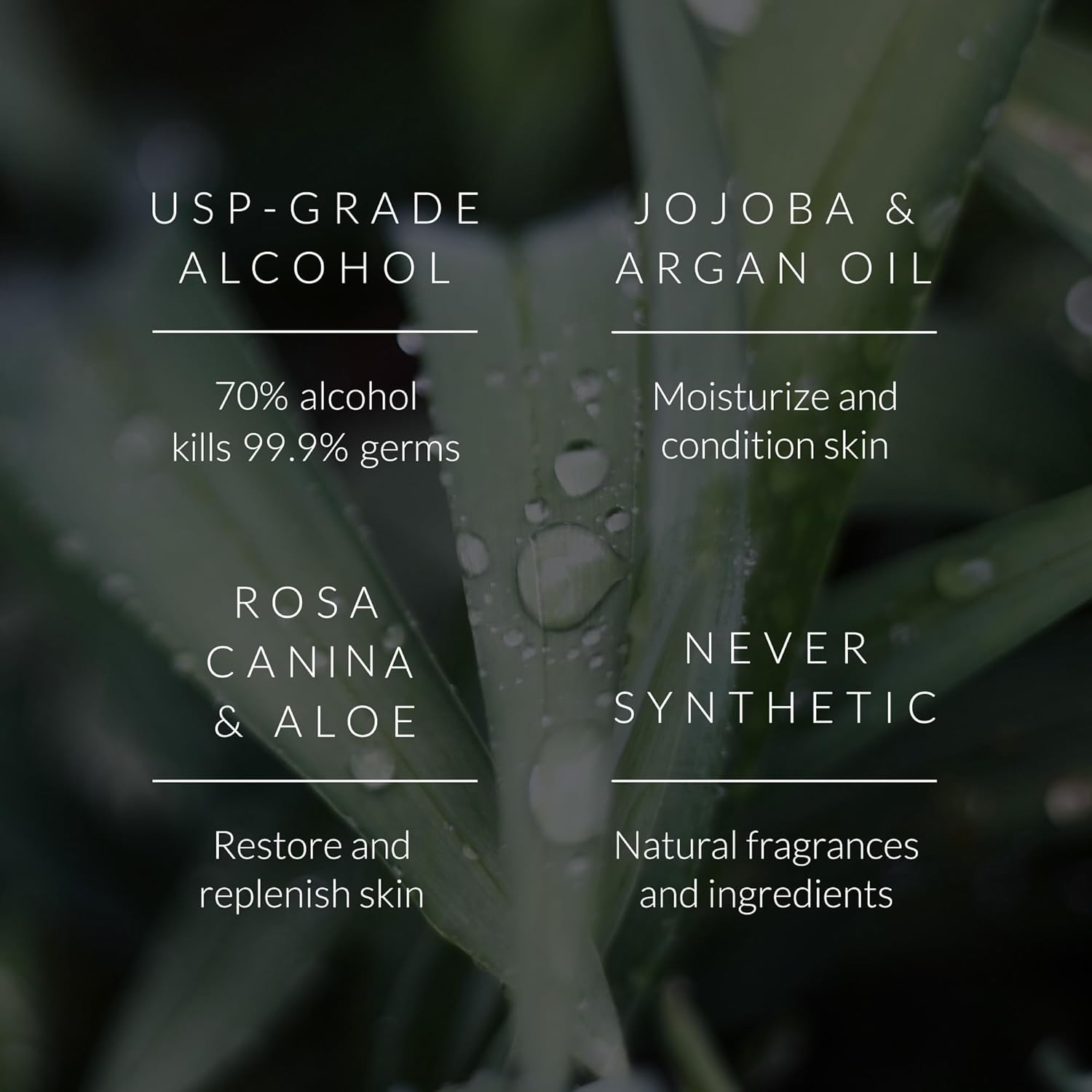 - MOISTURIZING, NON-STICKY SPRAY: 70% sugarcane-derived alcohol plus Jojoba, Argan, Rosehip, and Coconut oils. This hand sanitizer spray bottle is effective against common bacteria while keeping hands soft, not dry or sticky, and works perfectly as a travel size hand sanitizer.