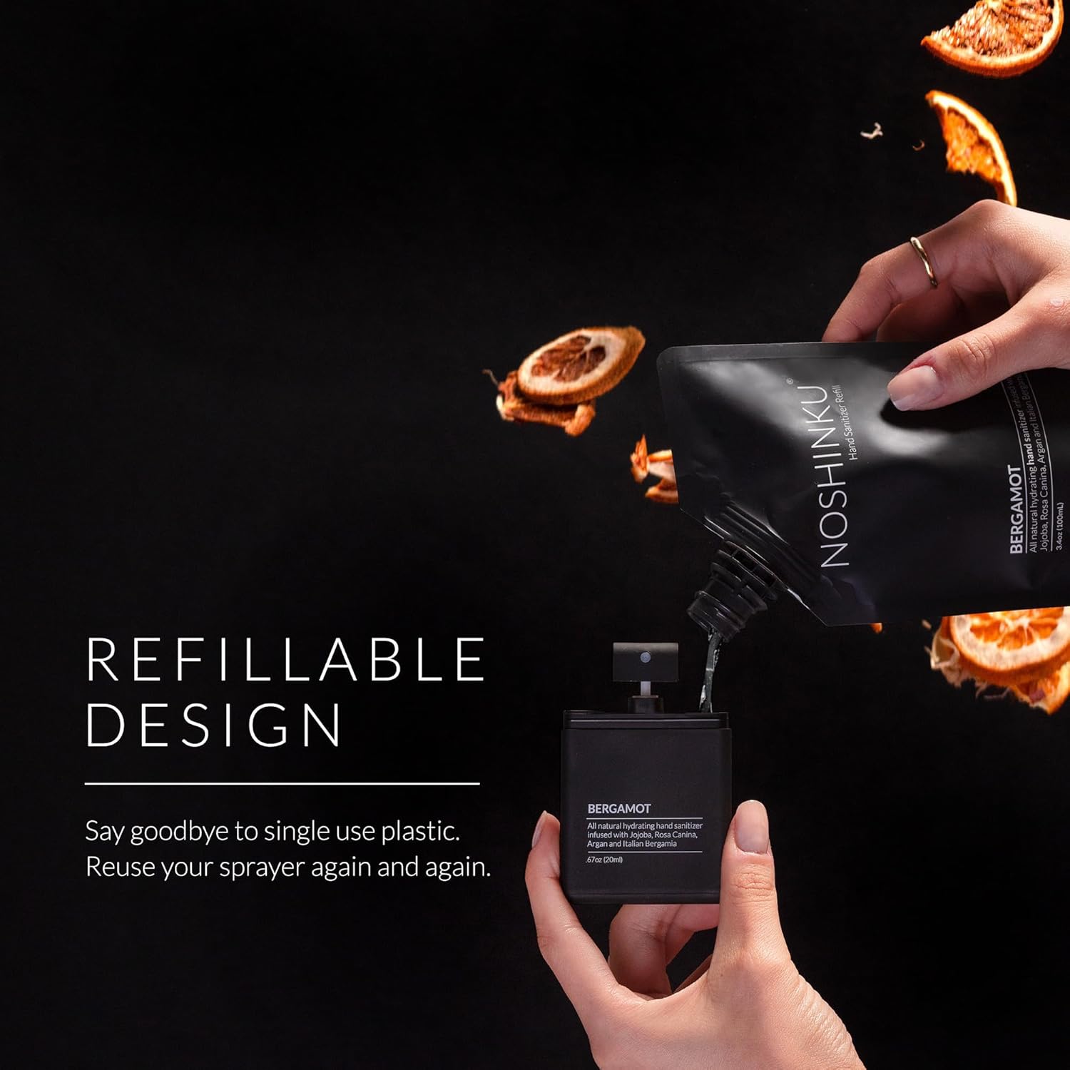 Noshinku Bergamot Pocket Hand Sanitizer Refill Kit: Refill Pouch + Sprayer Bundle | Organic Antibacterial Sanitizing Mist with Moisturizing Oils | FDA Registered | 70% Sugarcane Derived Alcohol