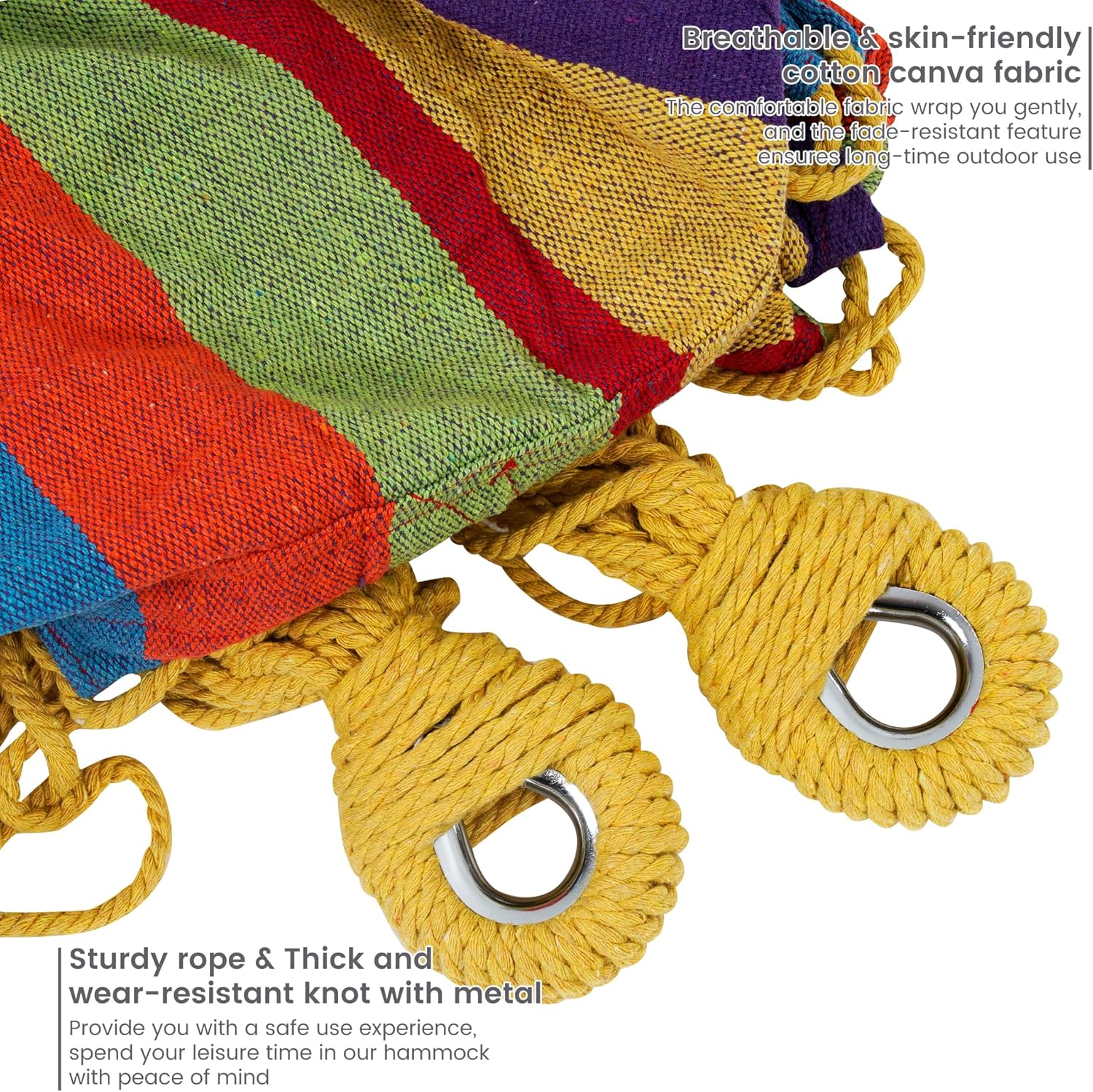 - Brazilian Style Hammock: The combination of colorful hammock and black steel stand will immediately light up your life. Gathered-end Style design distributes your weight to the center of the hammock, and wraps yourself like a cocoon. Don’t hesitate to decorate your world with Lazy Daze Hammocks.
