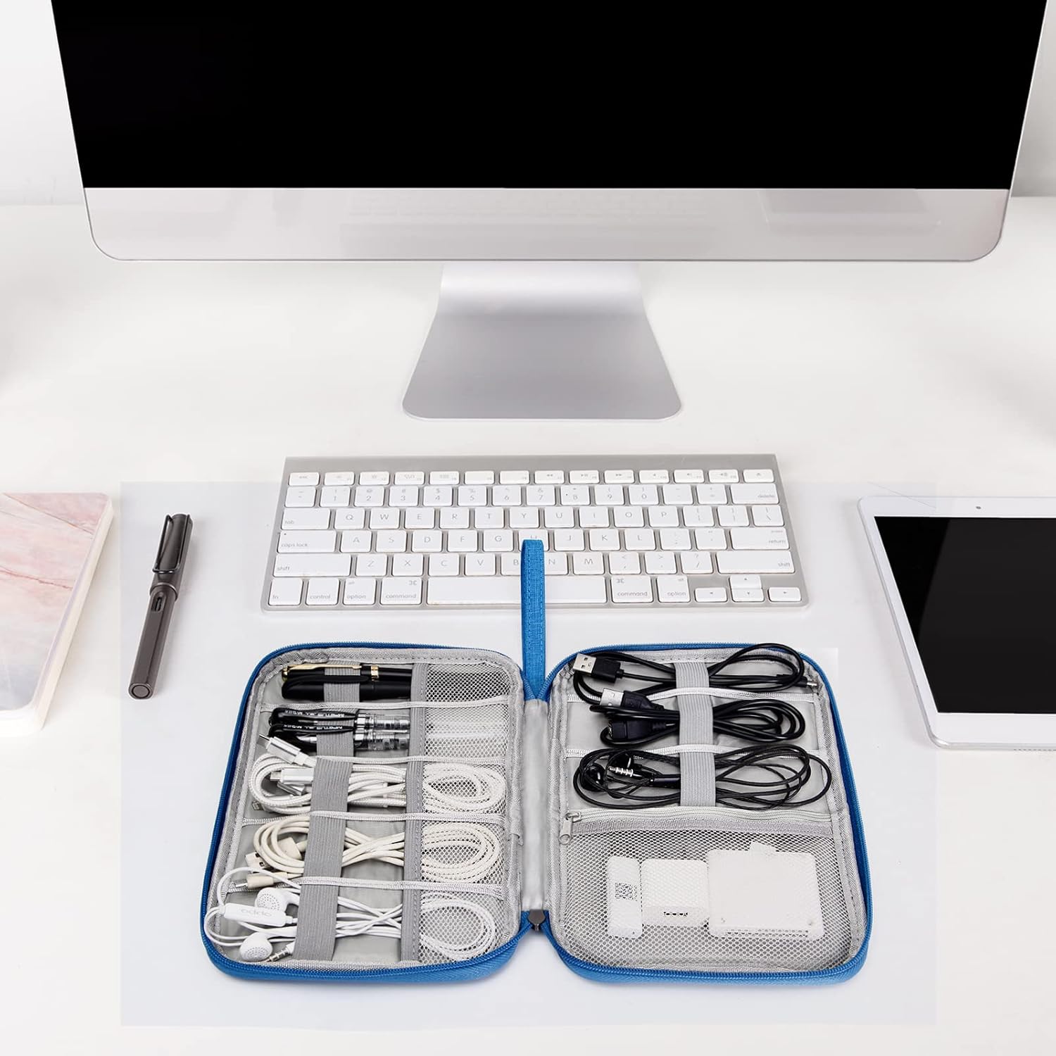 - ADEQUATE STORAGE-The digital bag provides 1 inner mesh pocket with zipper for your portable hard drive,5 mesh pockets with elastic loops for USB cables,earphones,etc,8 elastic loops for slender cables,earphones or pens to prevent cables from getting enttangled.In a word,this bag can store your electronic accessories,pens,jewelry or makeup.