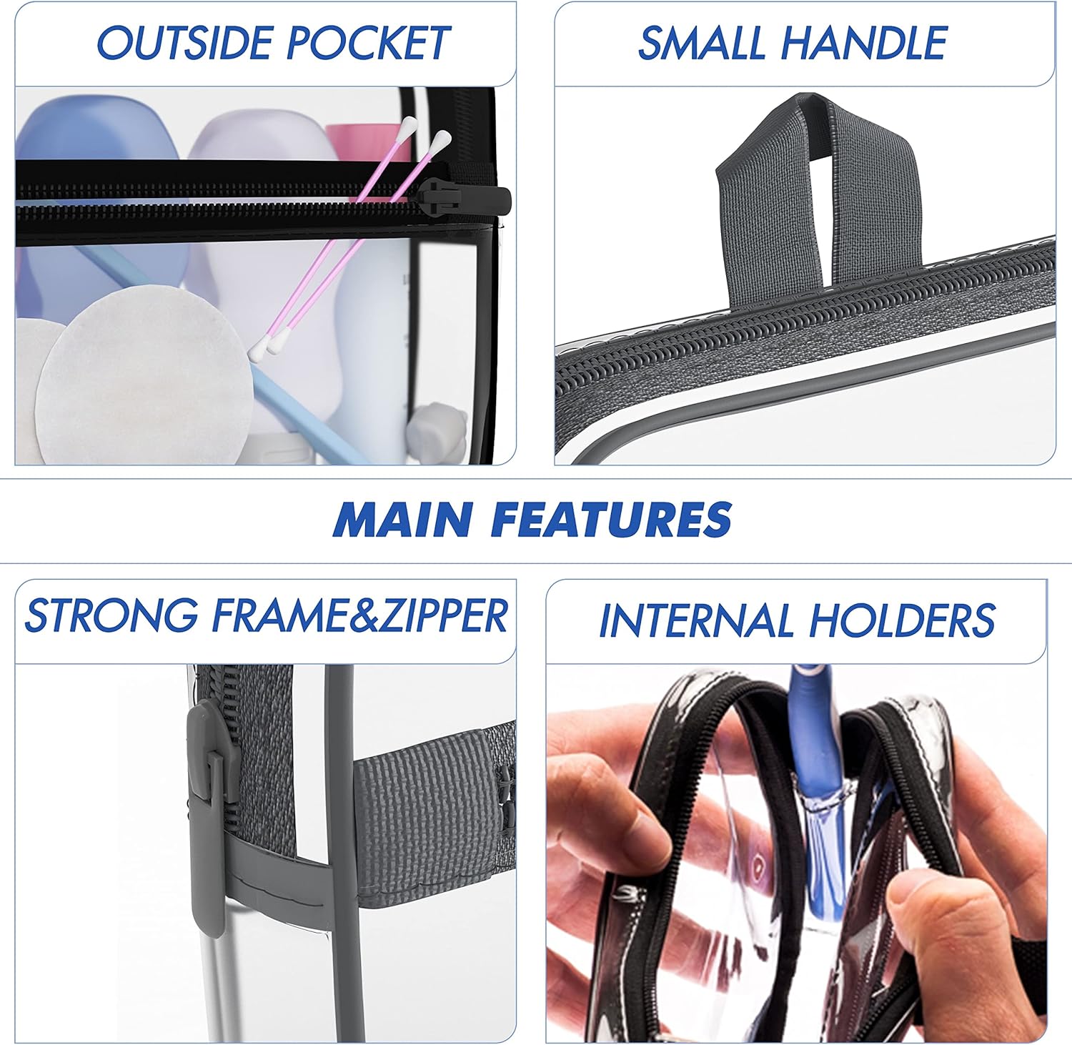 - Additional pocket: Our clear makeup bag organizer has an extra pocket for cotton discs, earplugs, and small items. This transparent zipper pouch also has holders for a toothbrush or razor.