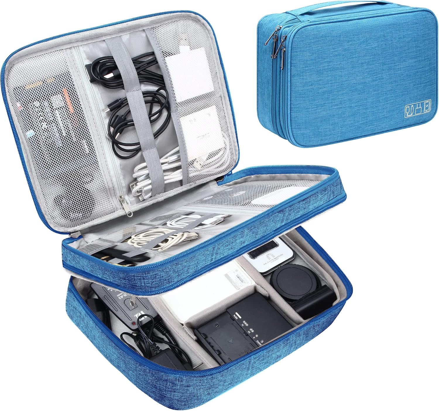 - 【DOUBLE LAYERS TECH ORGANIZER】- The cord organizer case is designed with 2 layers. The first layer to organize small electronic accessories like cords, cables, USB, chargers, earphones. The second layer to organize larger electronics accessories like tablet, power bank, adapters, hard drive, cellphone, mouse.